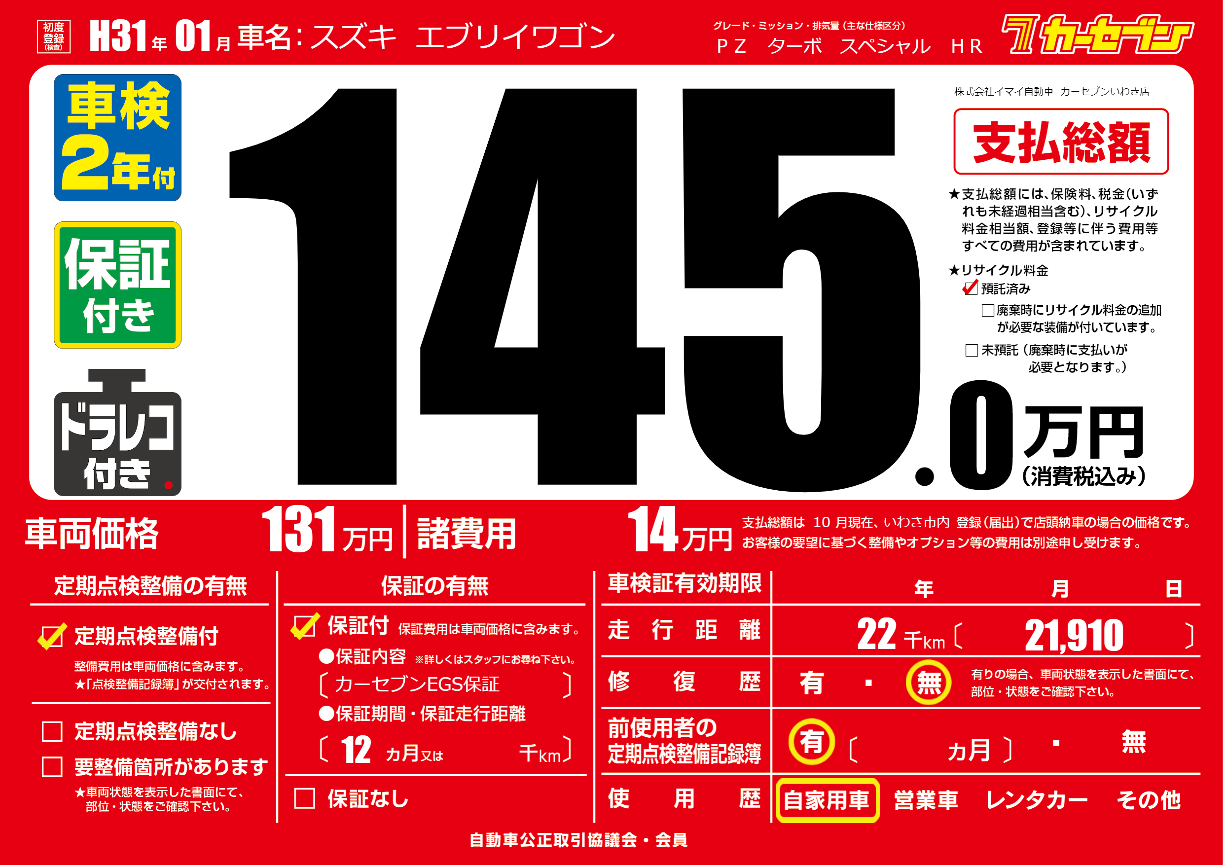 保証付き 保証内容(カーセブンEGS保証) 12ヶ月または千km |