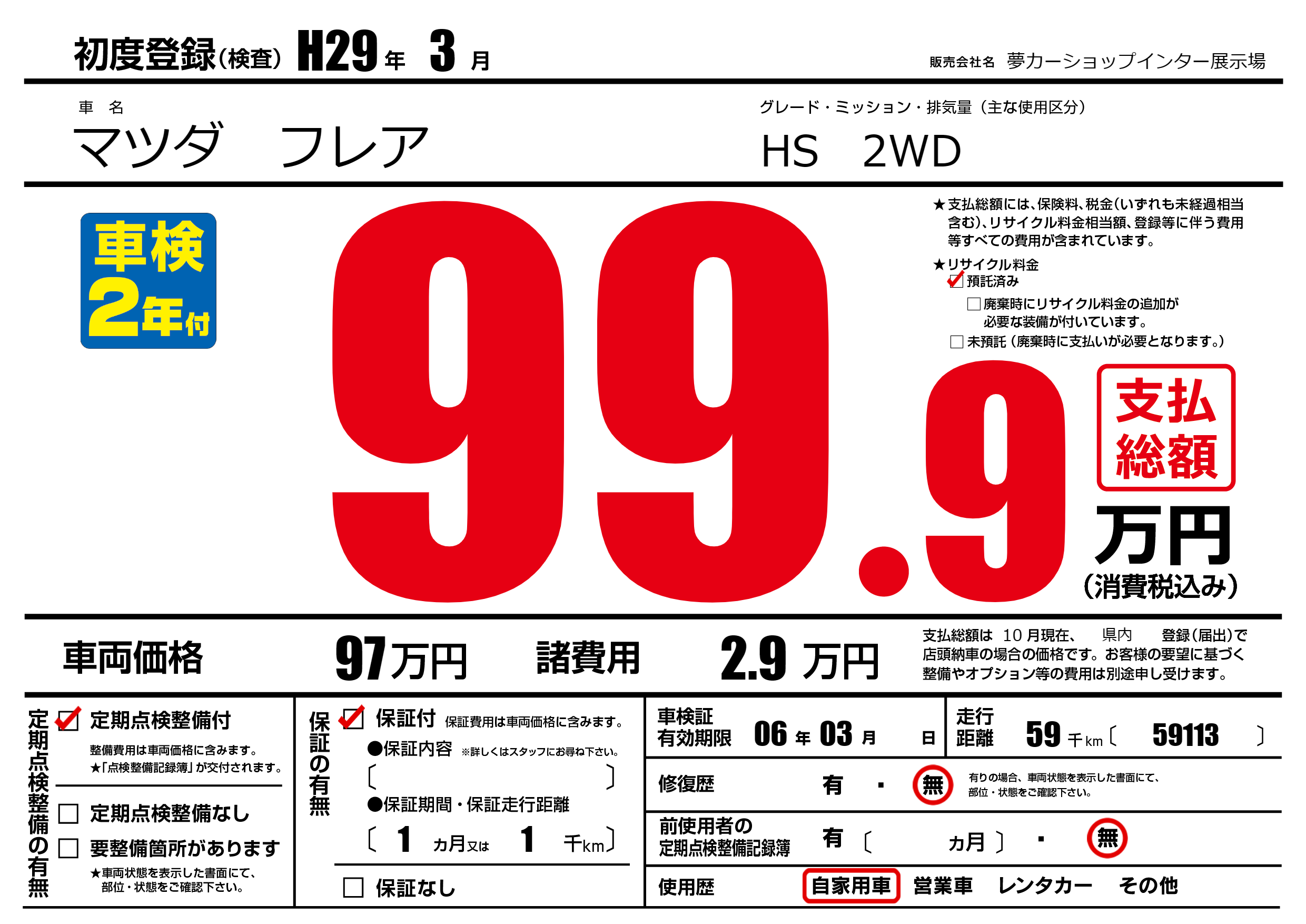 | 車名 | マツダ フレア | グレード ミッション 排気量 |