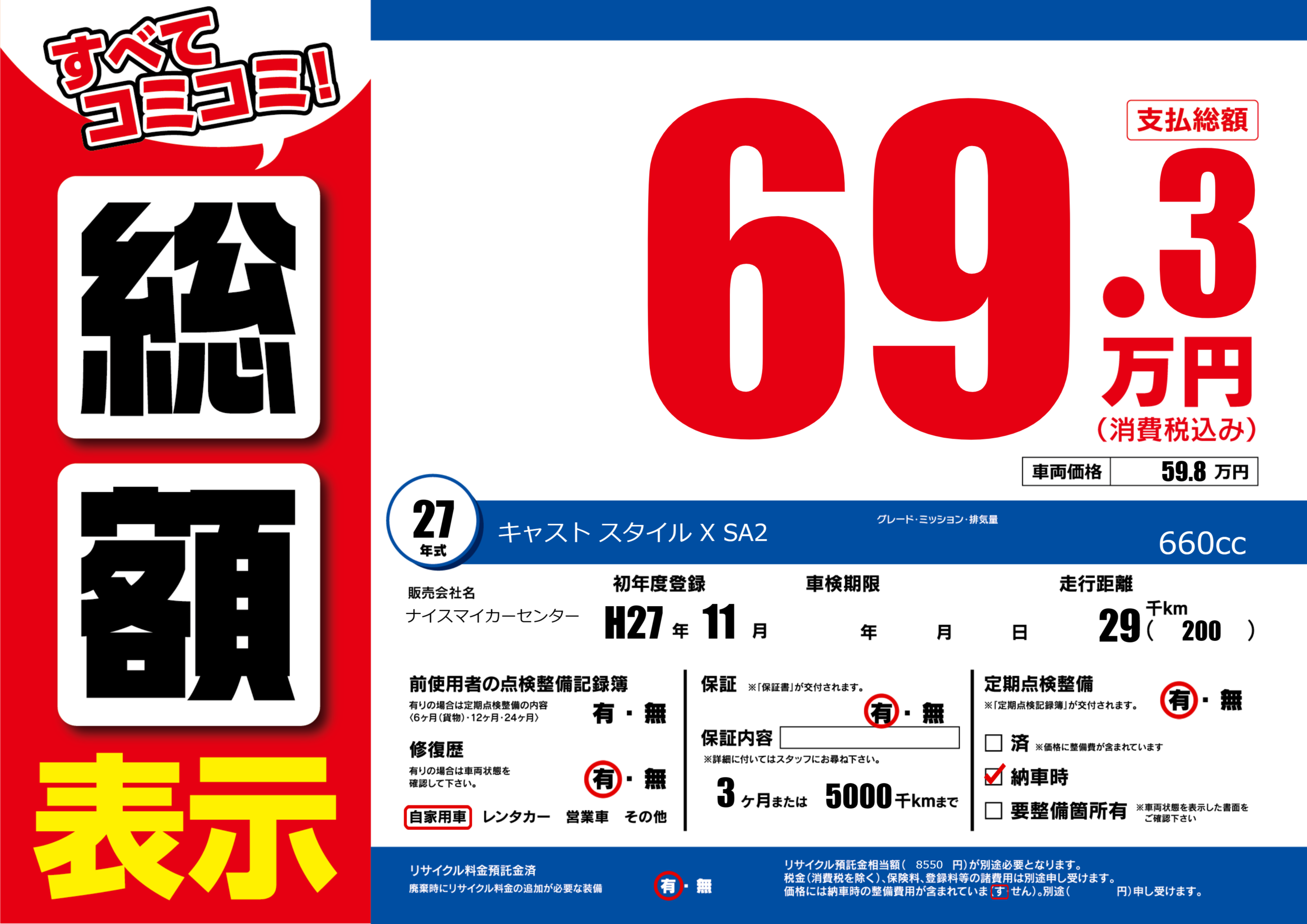 | 定期点検整備 | 定期点検整備あり 納車時あり | ||