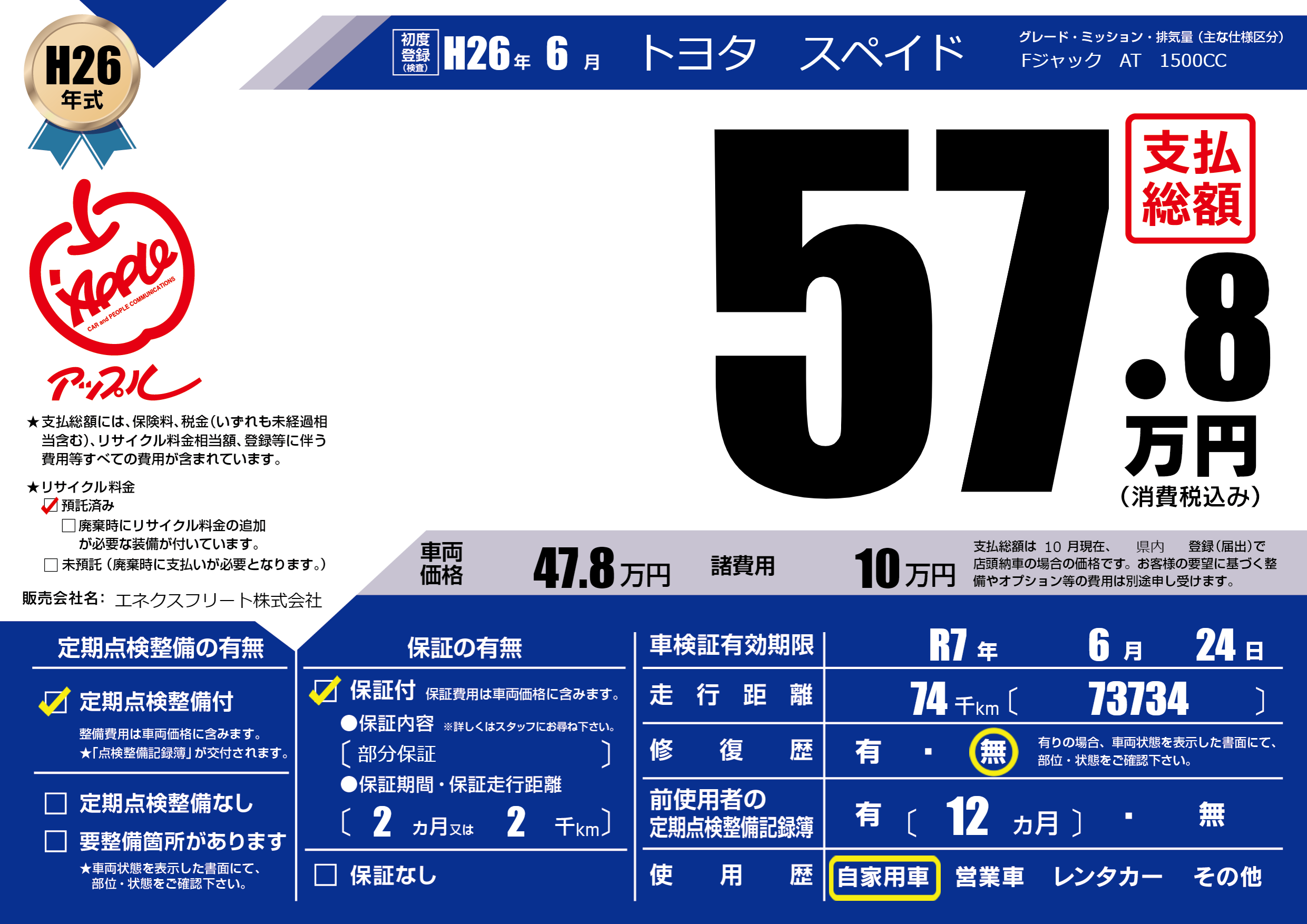 | 走行キロ | 7.4万km | 初年度登録 | H26年6月 |