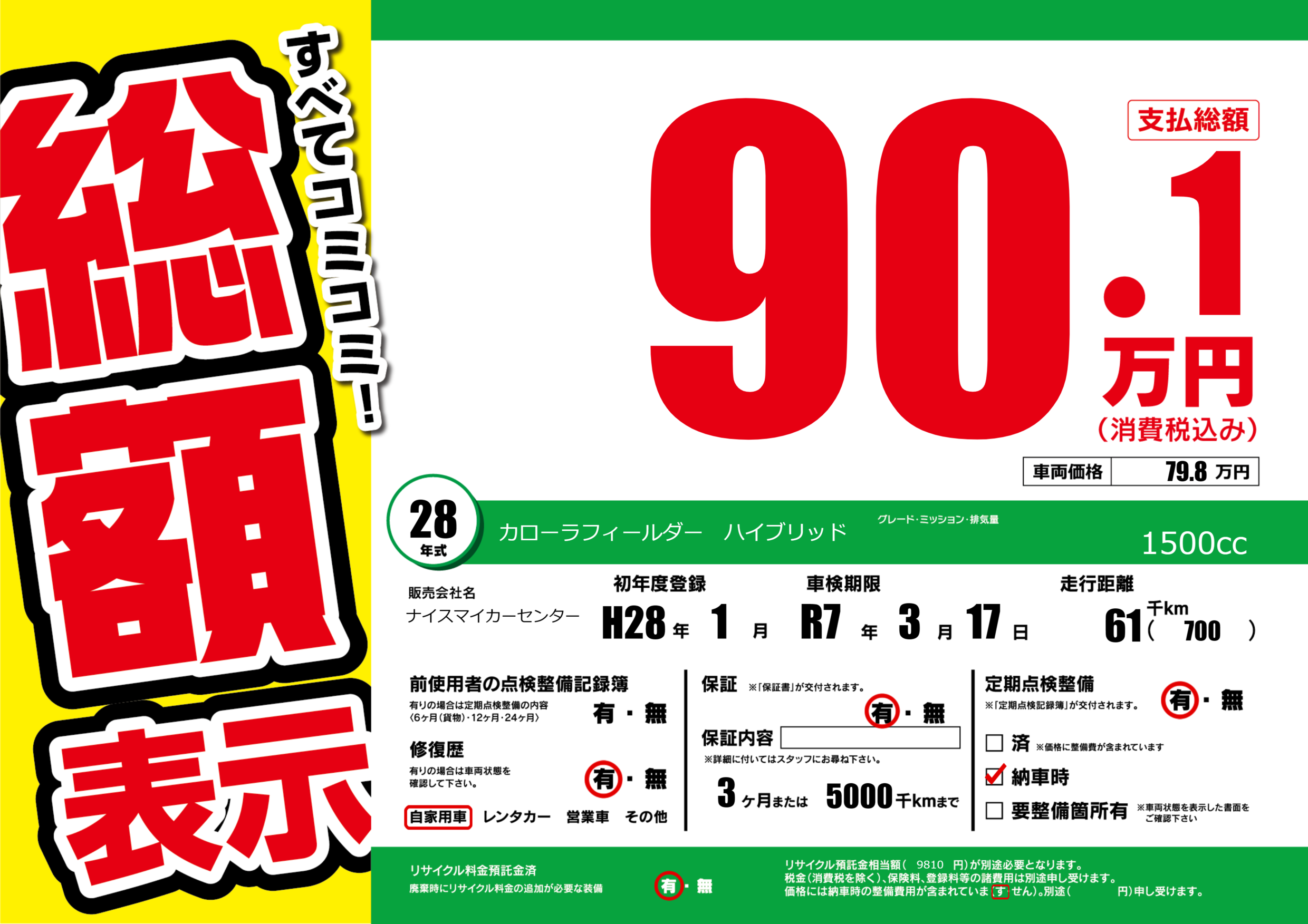 | 定期点検整備 | 定期点検整備あり 納車時あり | ||