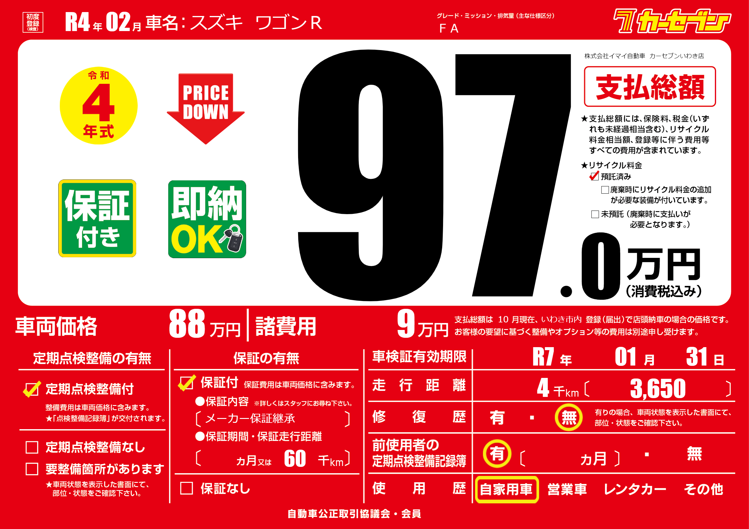 | 車名 | スズキ ワゴンR | グレード ミッション 排気量 |