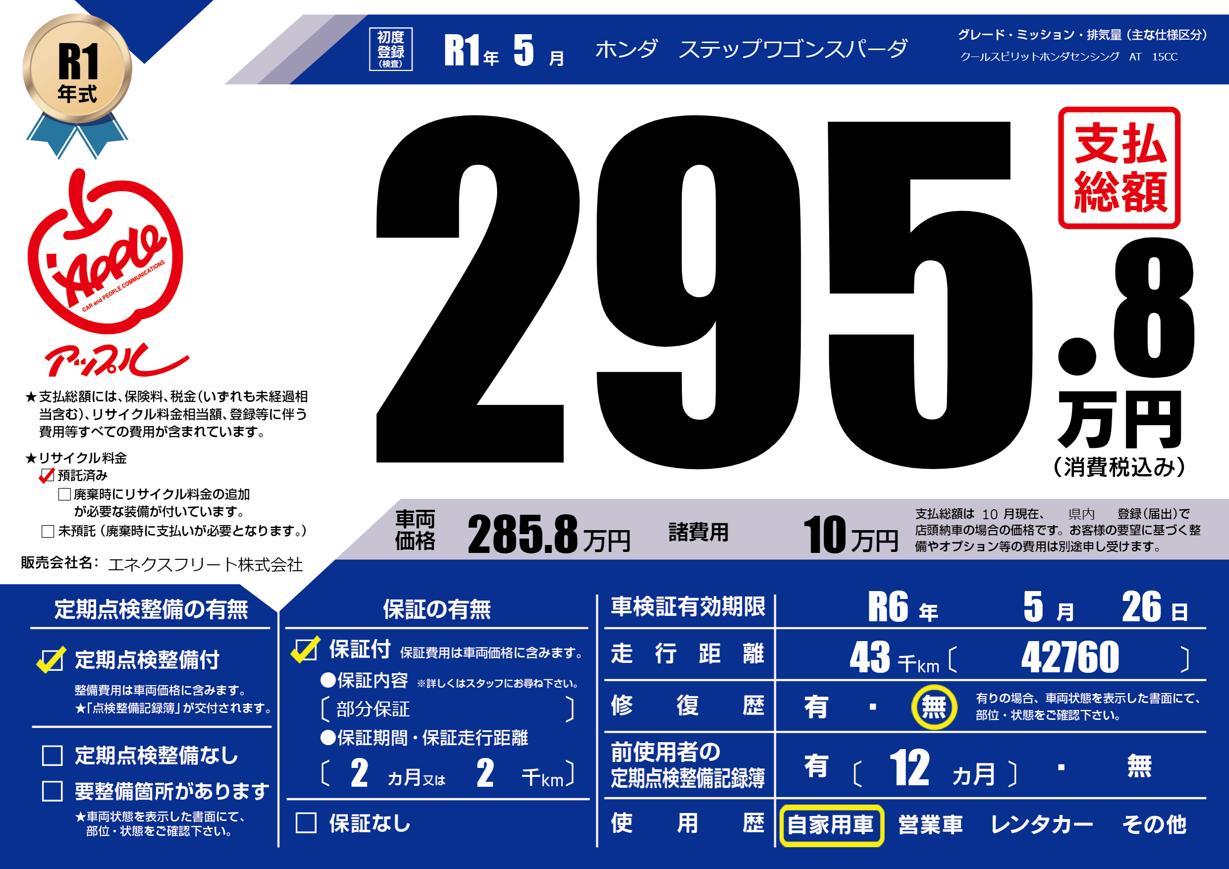 | 走行キロ | 4.3万km | 初年度登録 | R1年5月 |