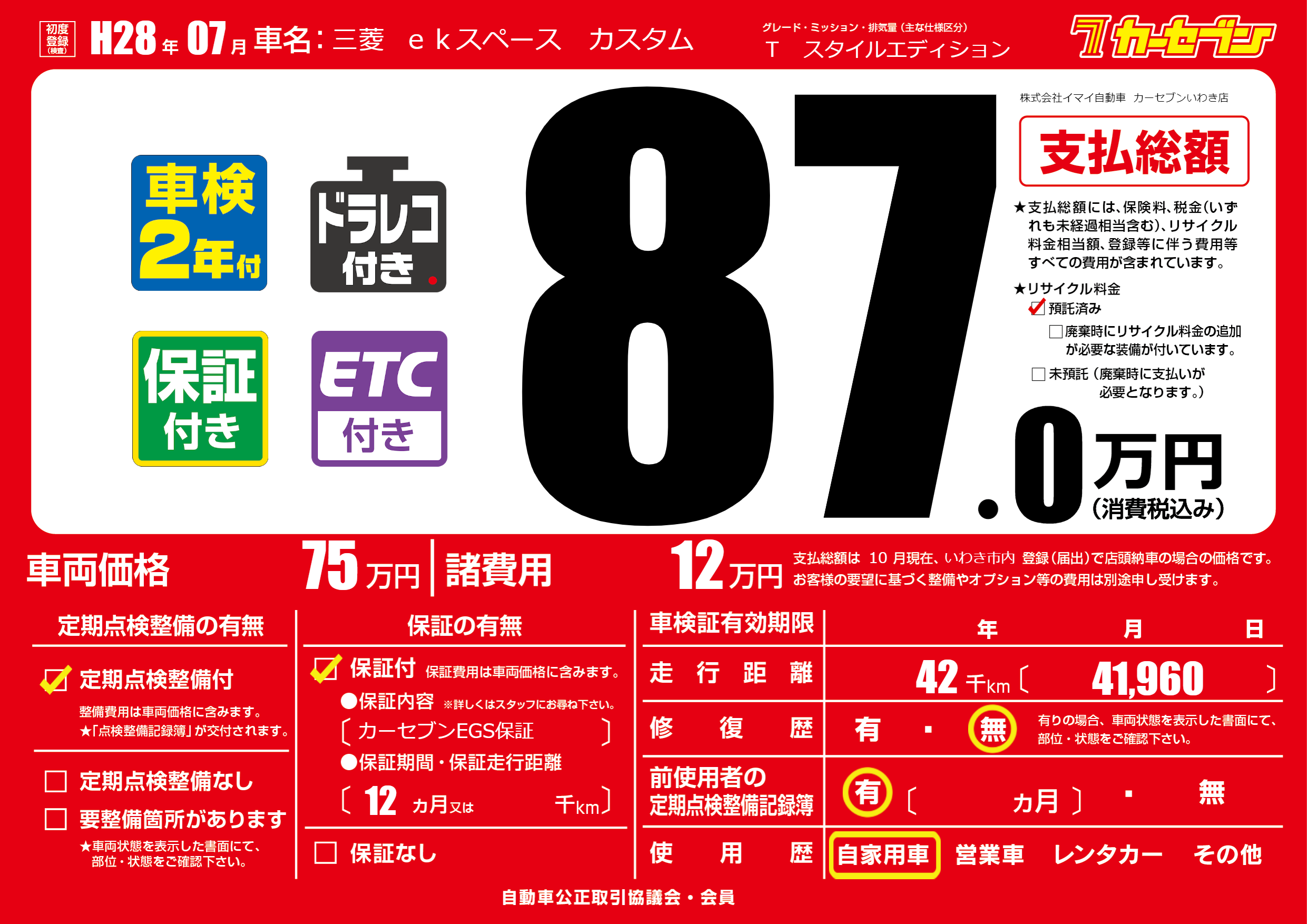 | 走行キロ | 4.2万km | 初年度登録 | H28年07月 |
