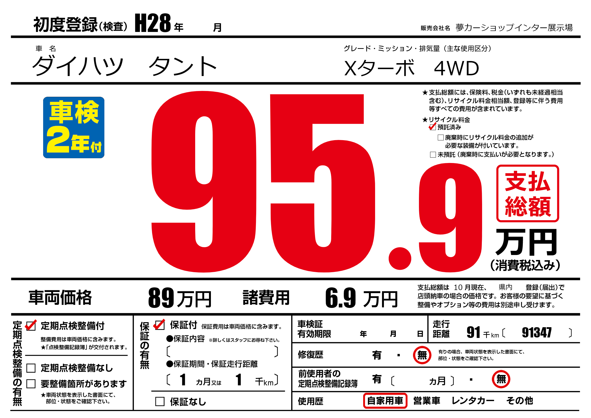| 車名 | ダイハツ タント | グレード ミッション 排気量 |