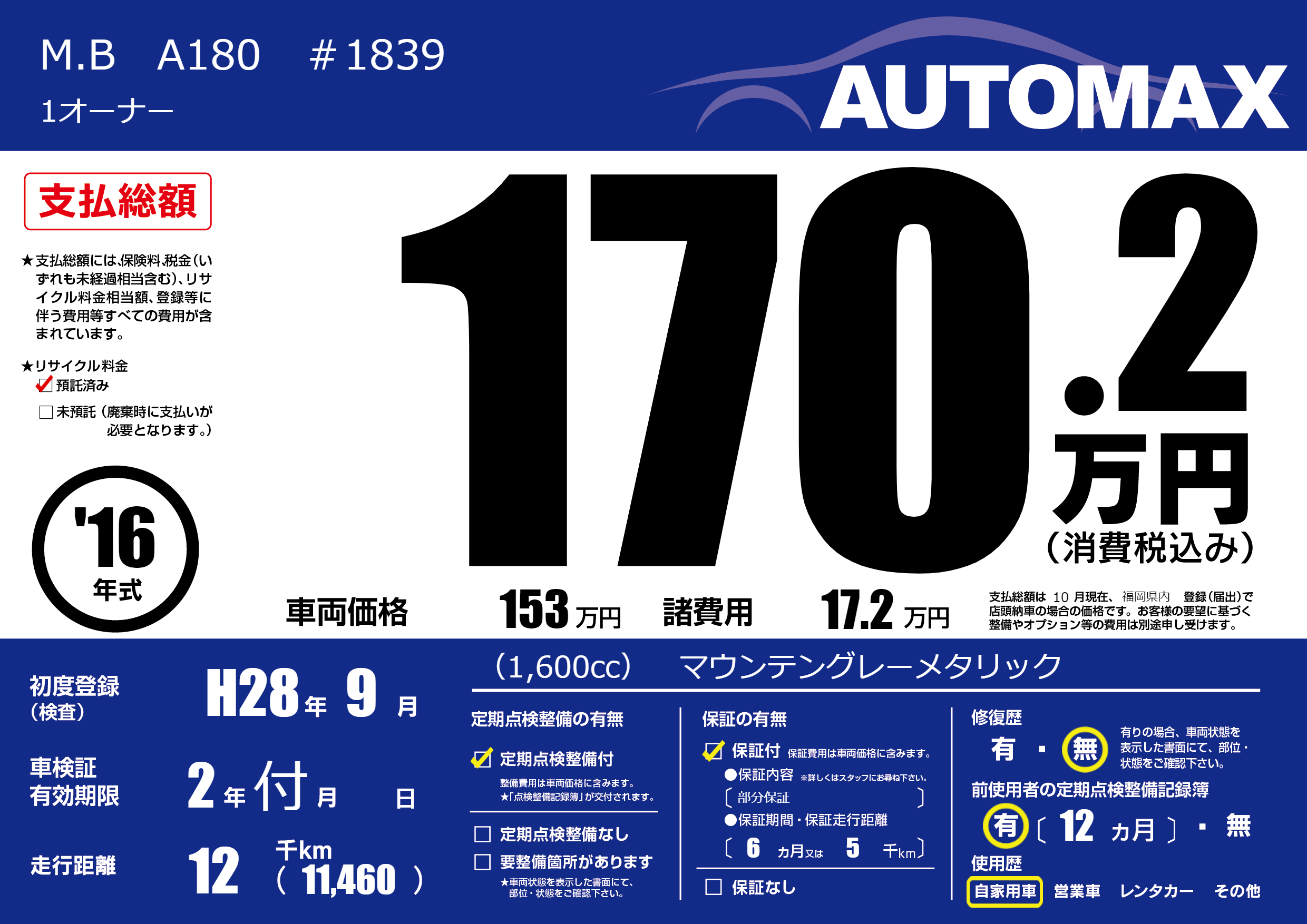 | 車名 | M.B A180 #1839 | グレード ミッション 排気量 |