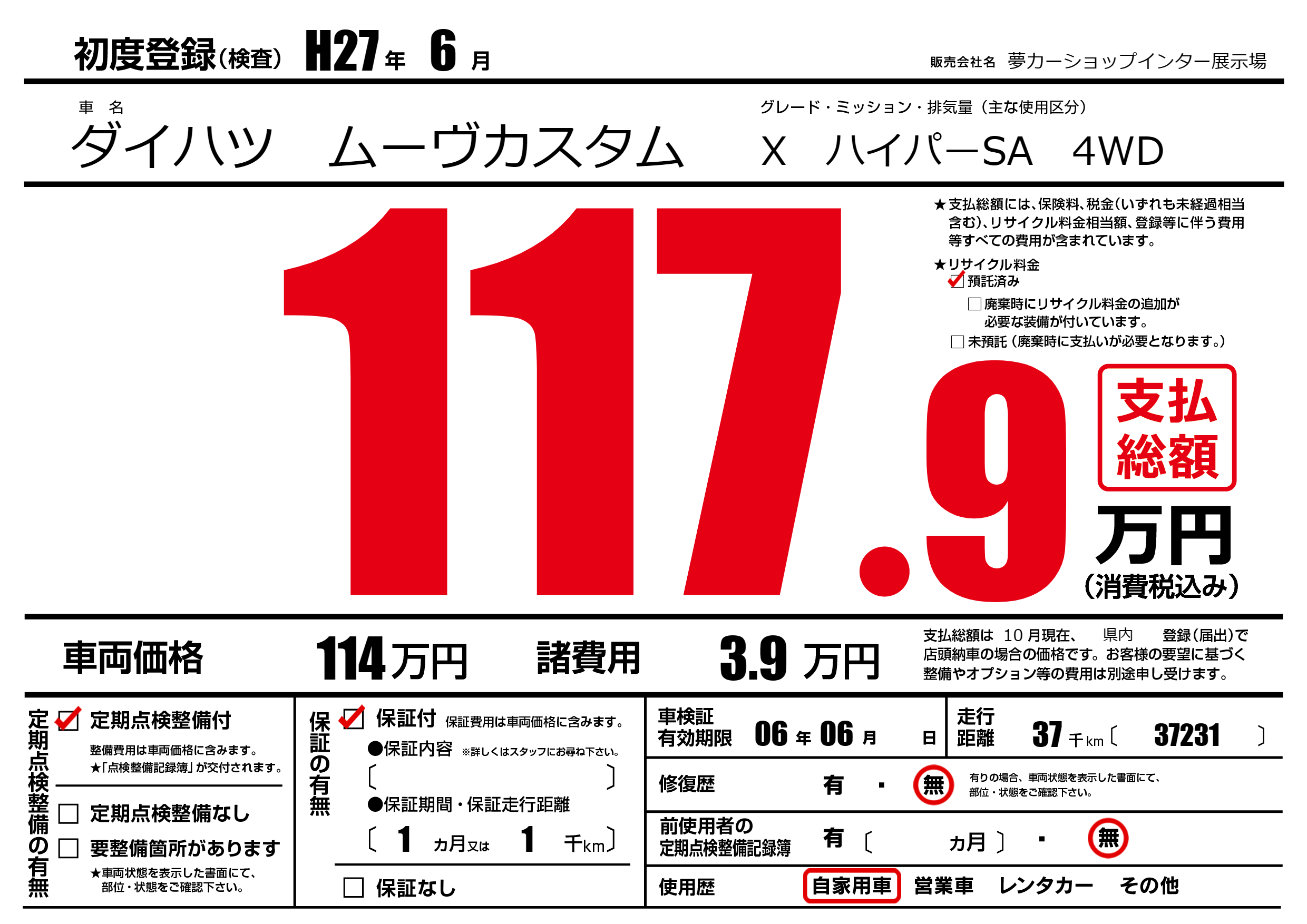 | 走行キロ | 3.7万km | 初年度登録 | H27年6月 |