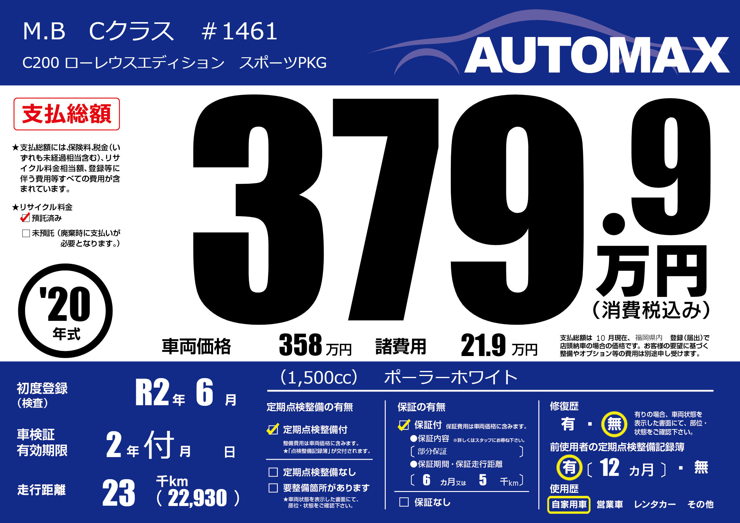 | 車名 | M.B Cクラス #1461 | グレード ミッション 排気量 |