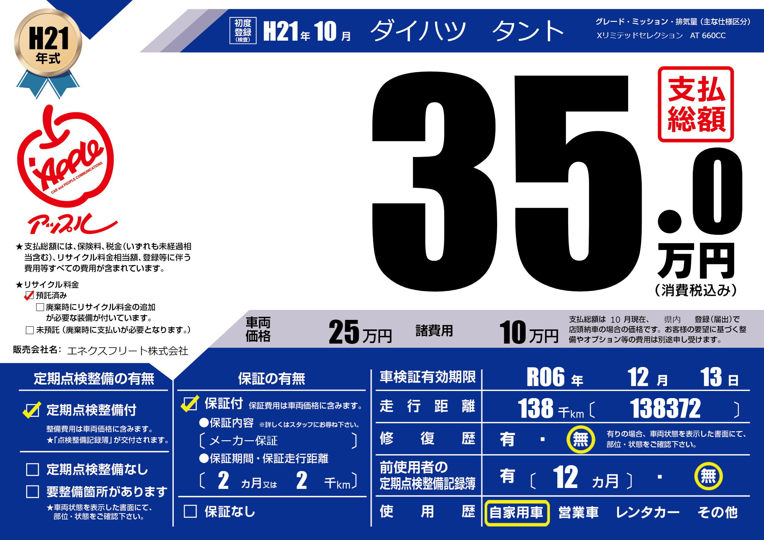 | 走行キロ | 13.8万km | 初年度登録 | H21年10月 |