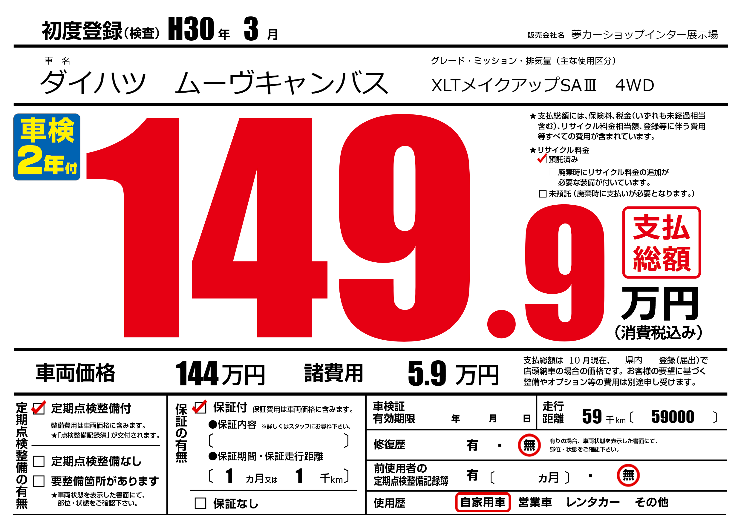 | 走行キロ | 5.9万km | 初年度登録 | H30年3月 |