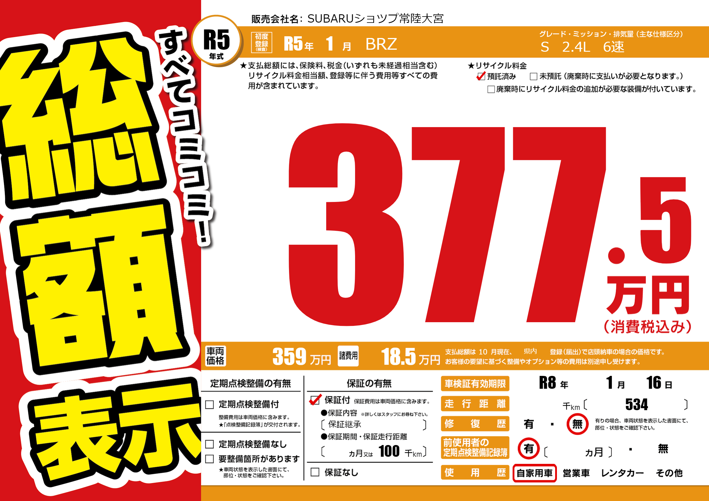 | 車名 | BRZ | グレード ミッション 排気量 |