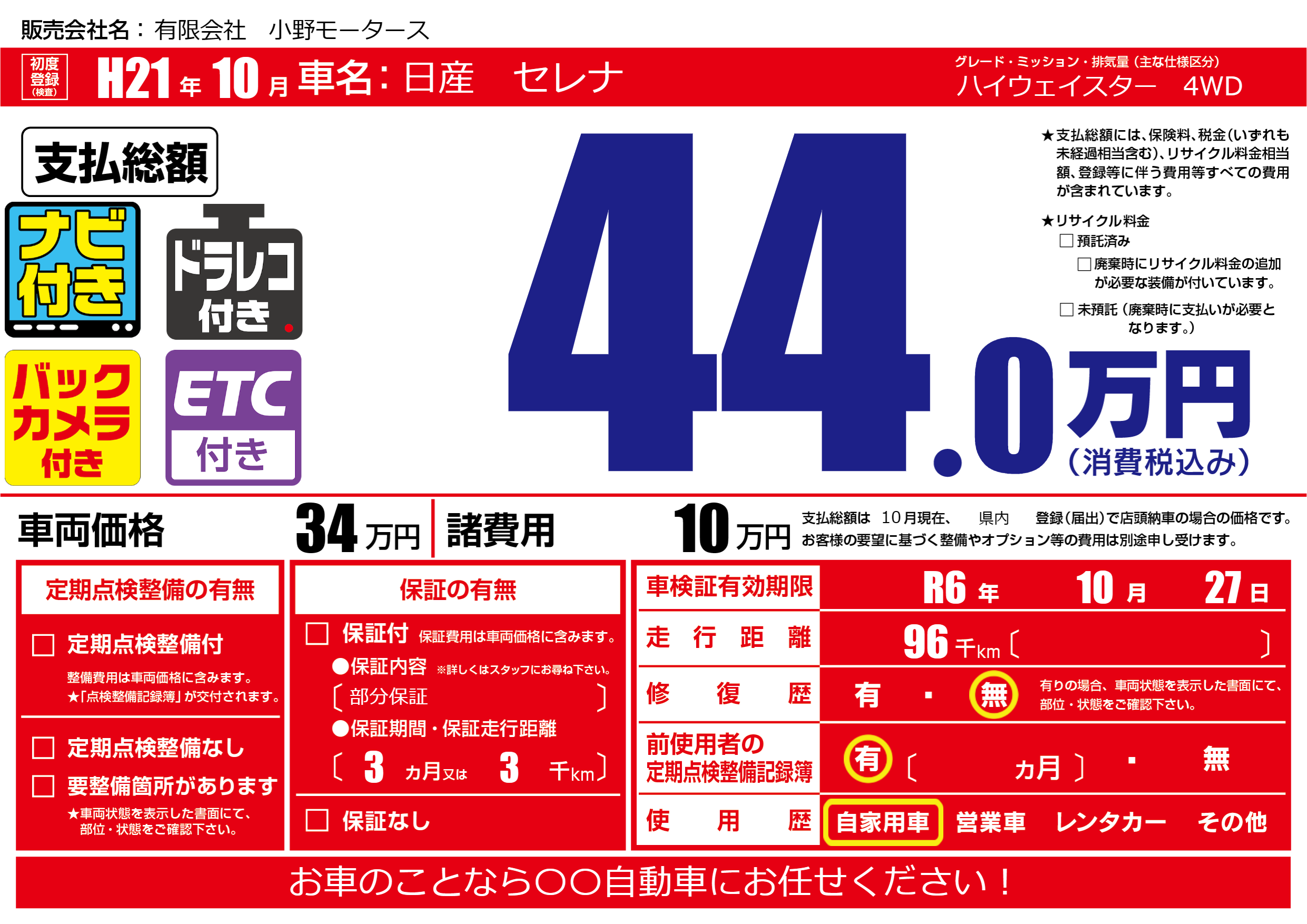 | 走行キロ | 9.6万km | 初年度登録 | H21年10月 |