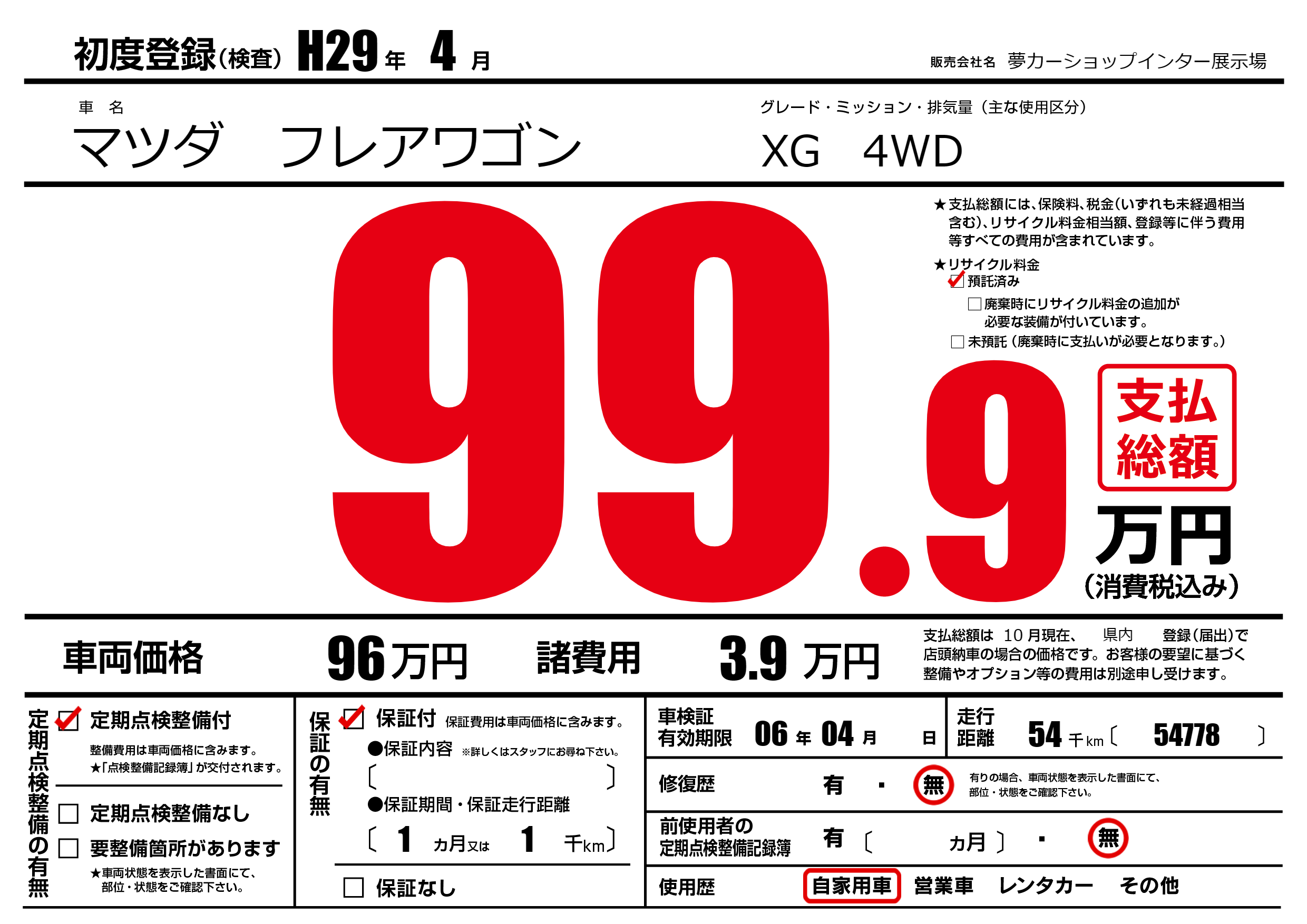 | 車名 | マツダ フレアワゴン | グレード ミッション 排気量 |