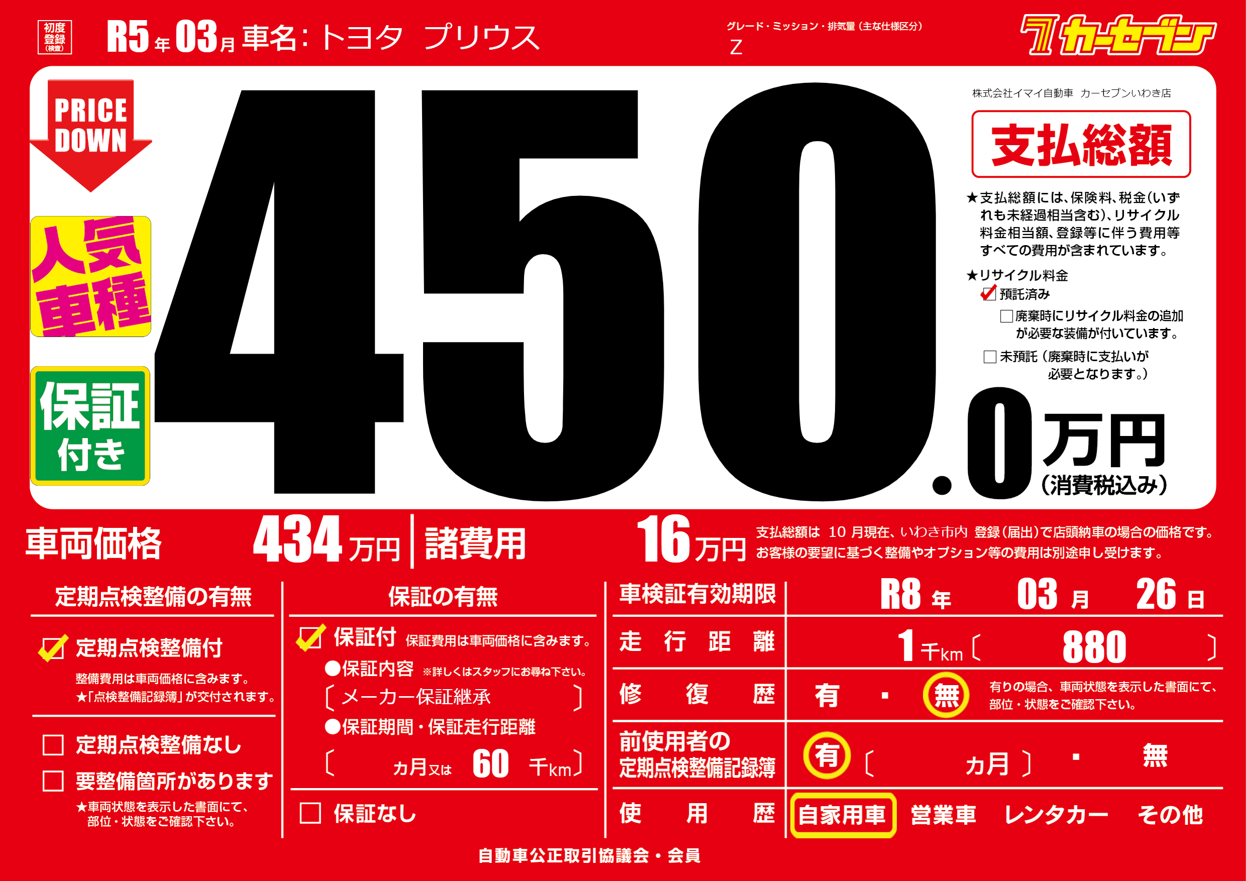 | 車名 | トヨタ プリウス | グレード ミッション 排気量 |