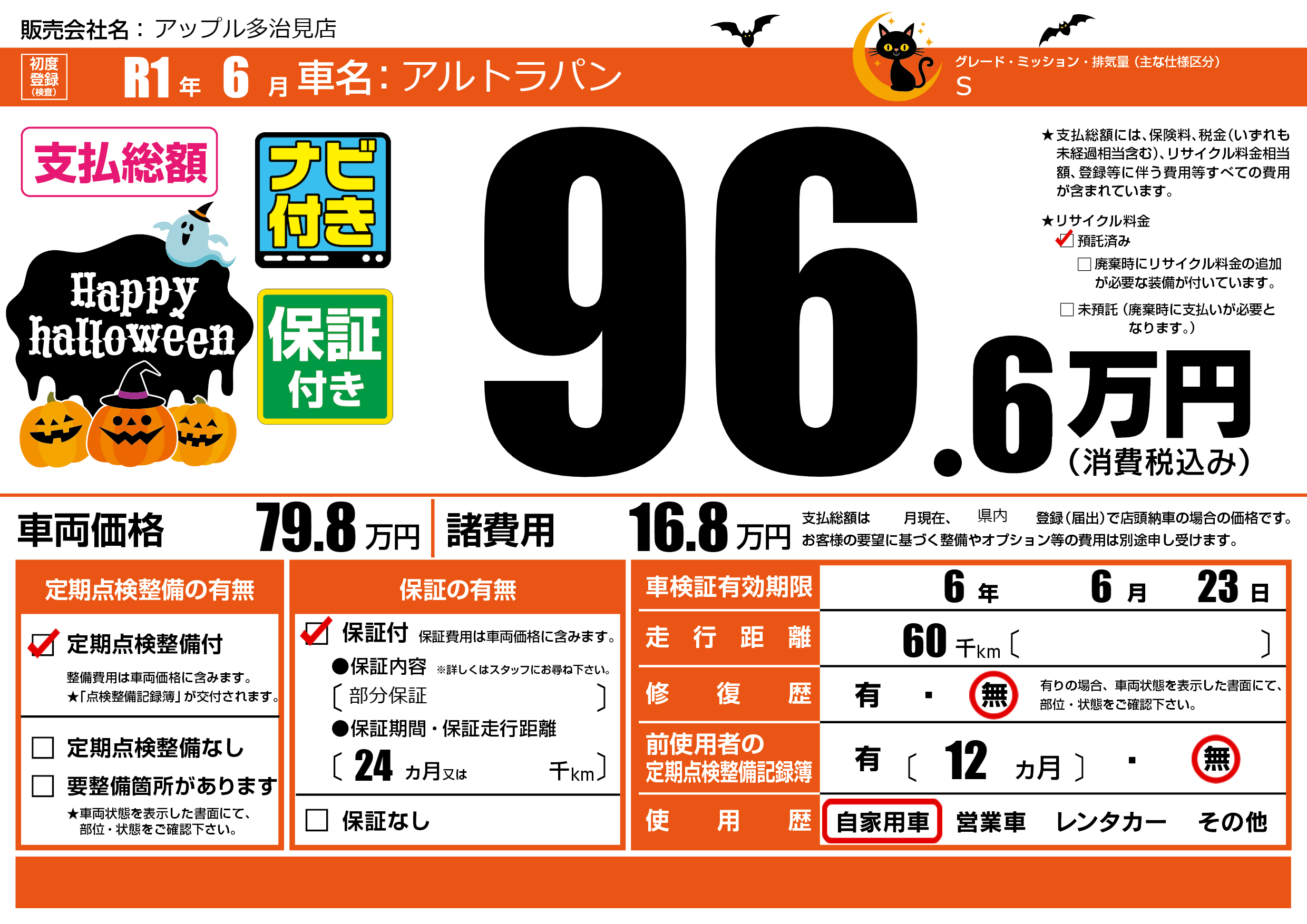 | 走行キロ | 6万km | 初年度登録 | R1年6月 |
