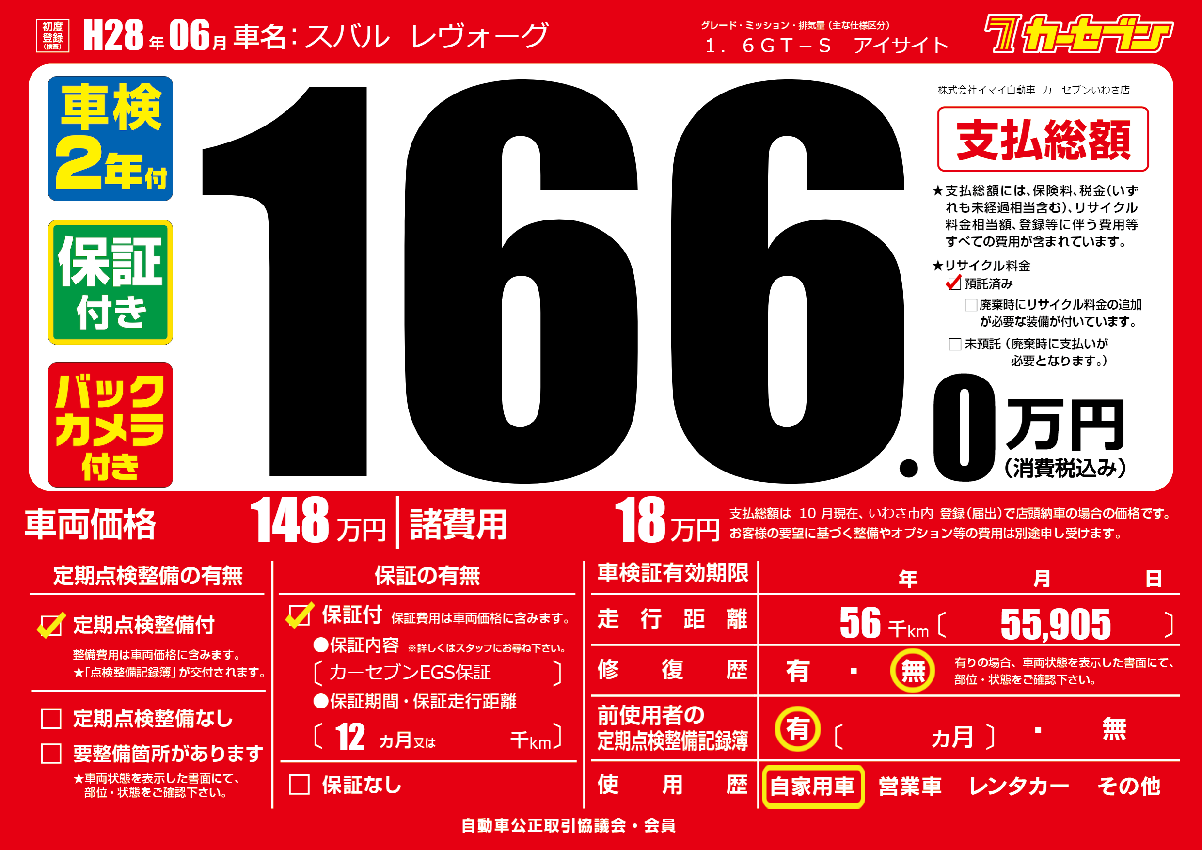 | 車名 | スバル レヴォーグ | グレード ミッション 排気量 |