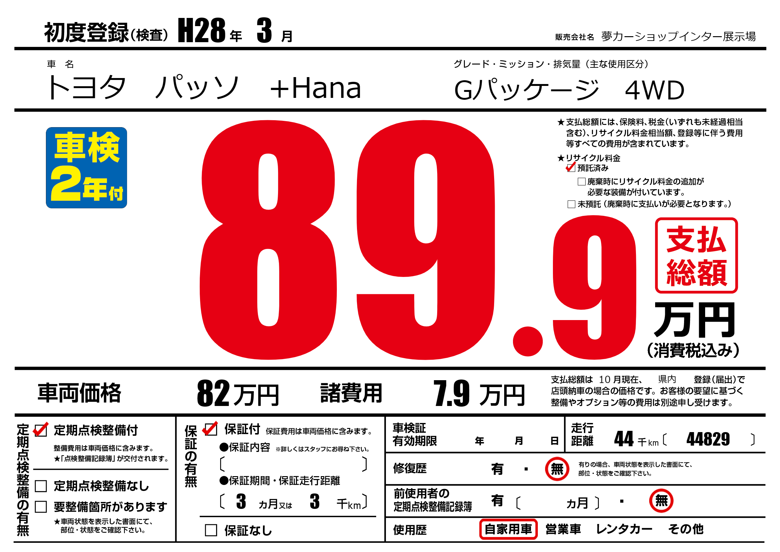 | 車名 | トヨタ パッソ +Hana | グレード ミッション 排気量 |