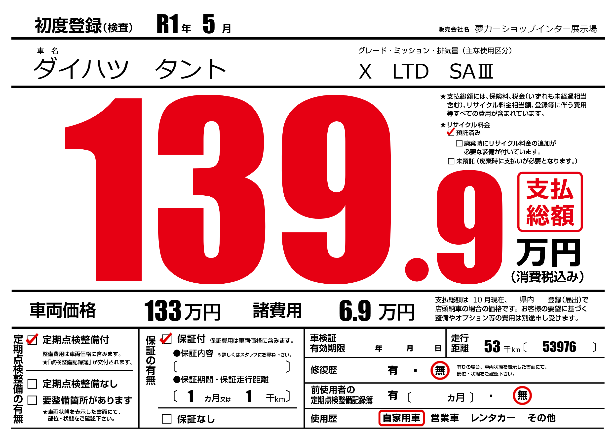 | 車名 | ダイハツ タント | グレード ミッション 排気量 |