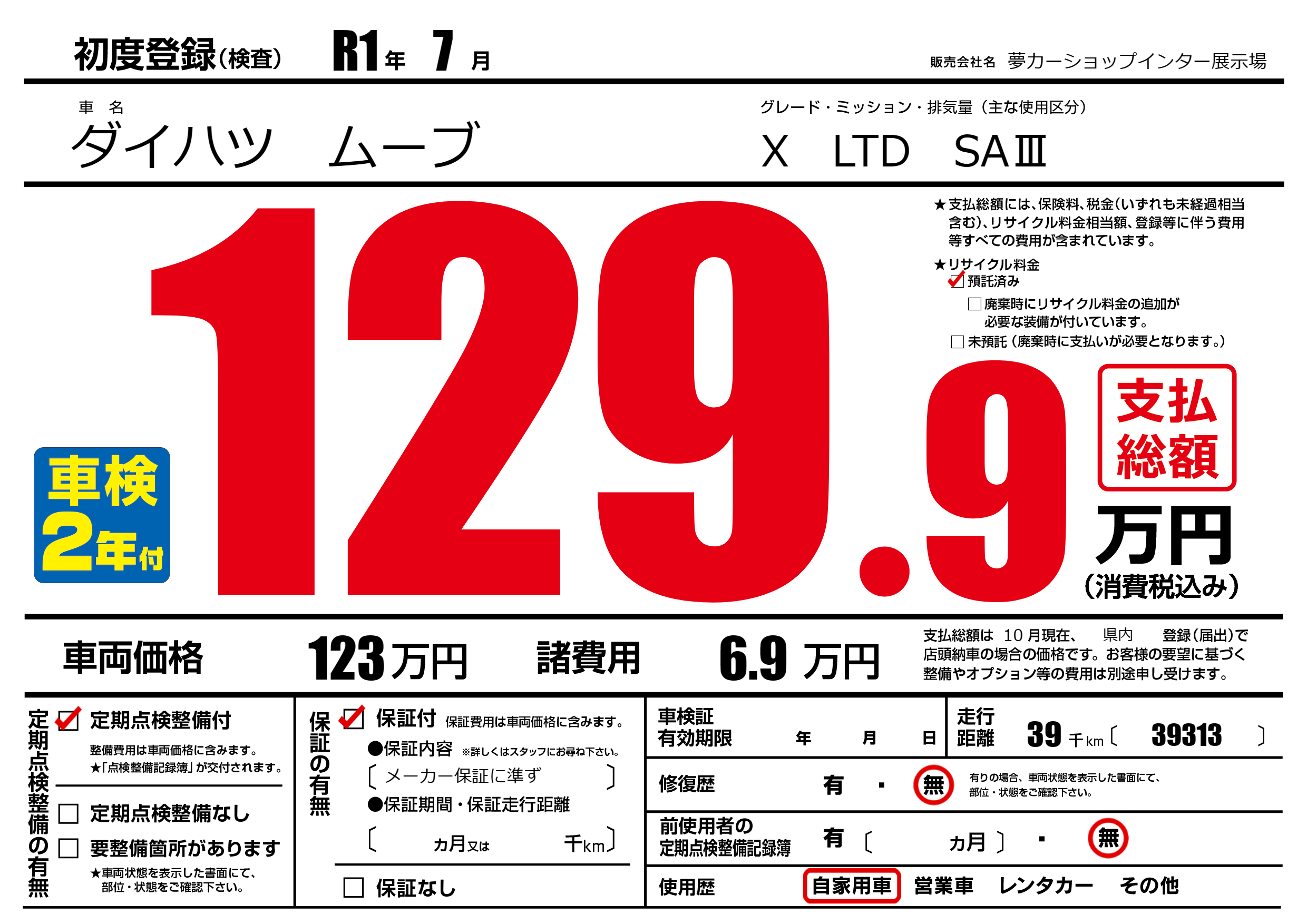 | 走行キロ | 3.9万km | 初年度登録 | R1年7月 |
