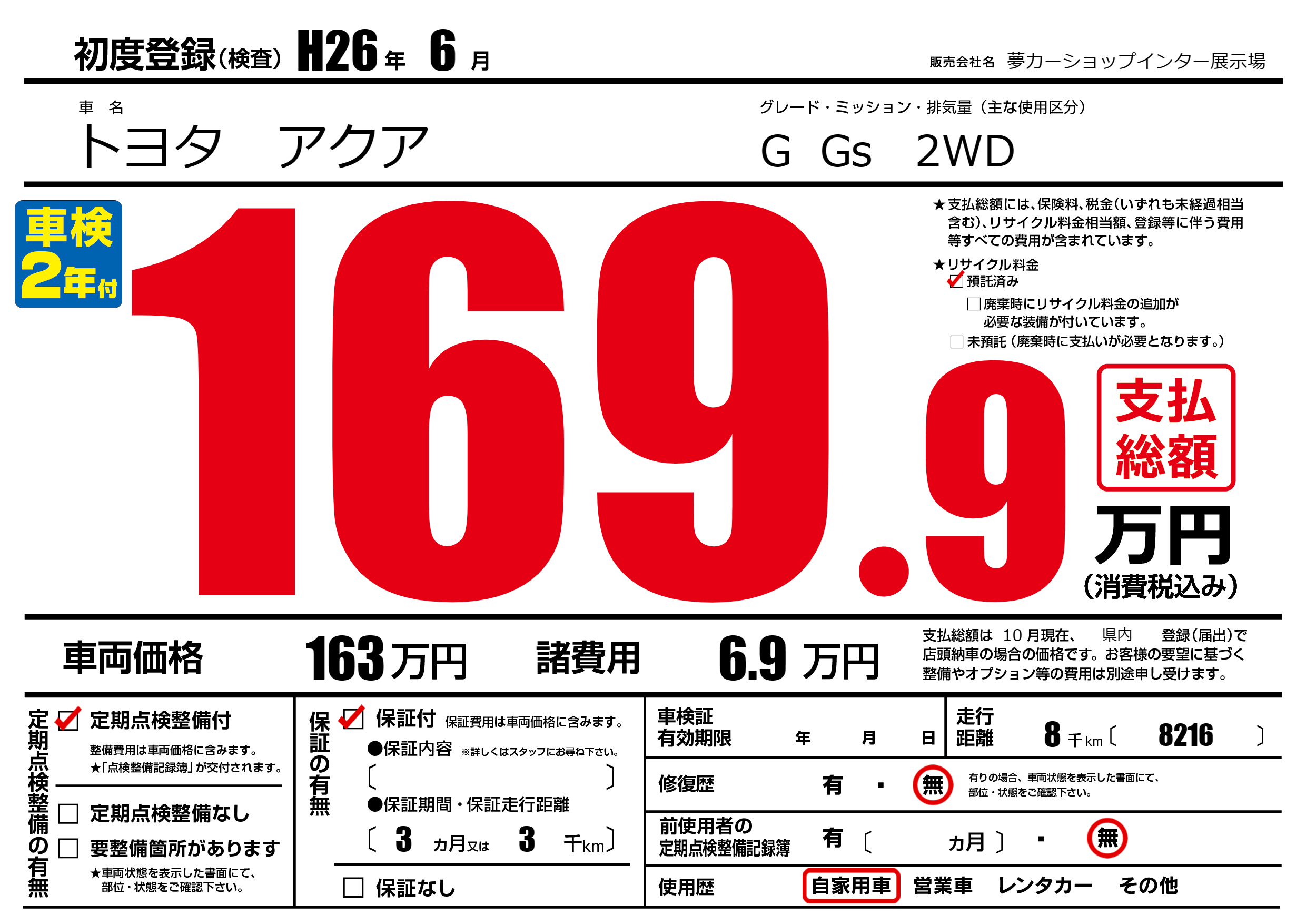 | 走行キロ | 0.8万km | 初年度登録 | H26年6月 |