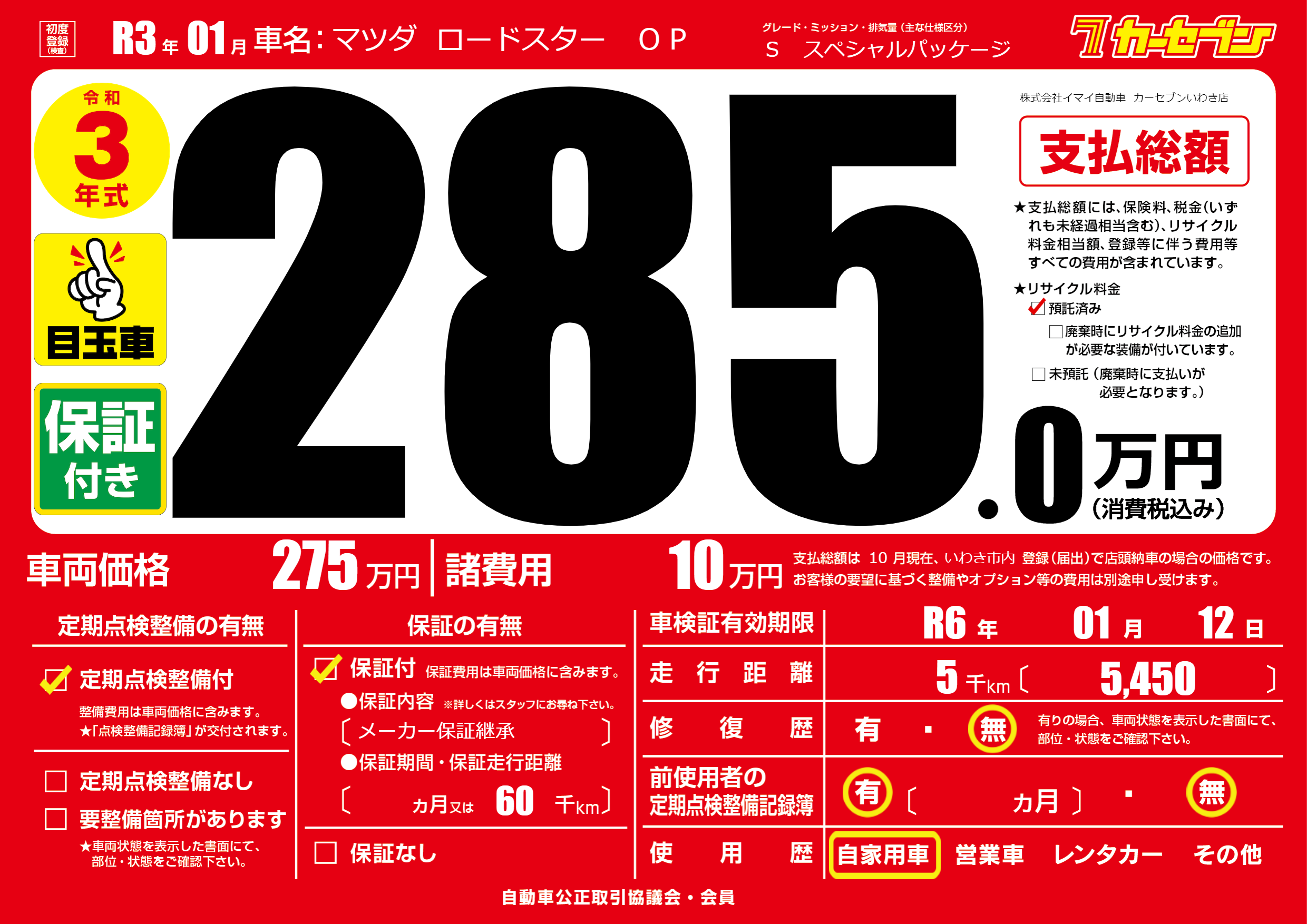 | 車検制限 | R6年 01月 12日 | ||