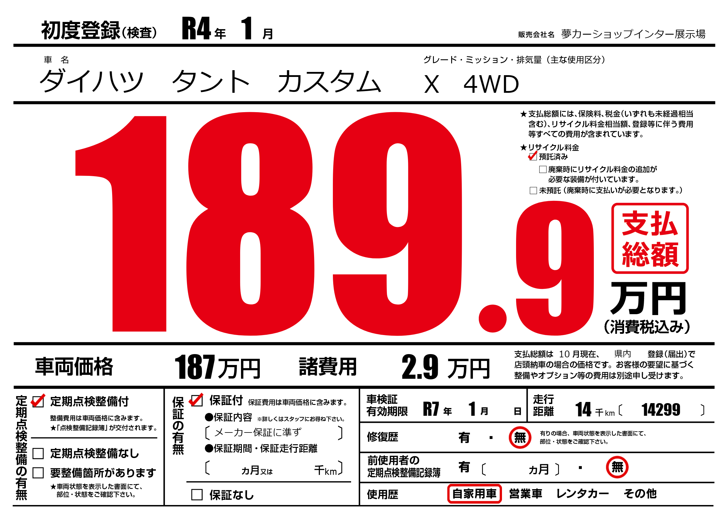 | 車名 | ダイハツ タント カスタム | グレード ミッション 排気量 |