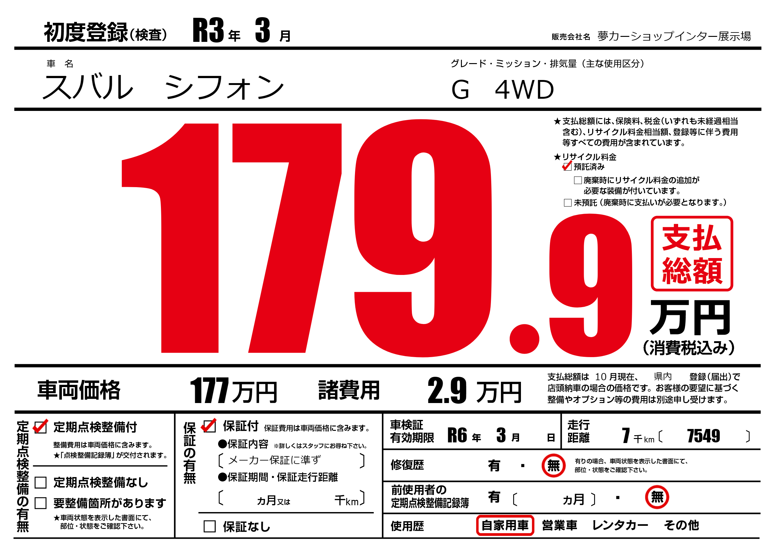 | 車名 | スバル シフォン | グレード ミッション 排気量 |