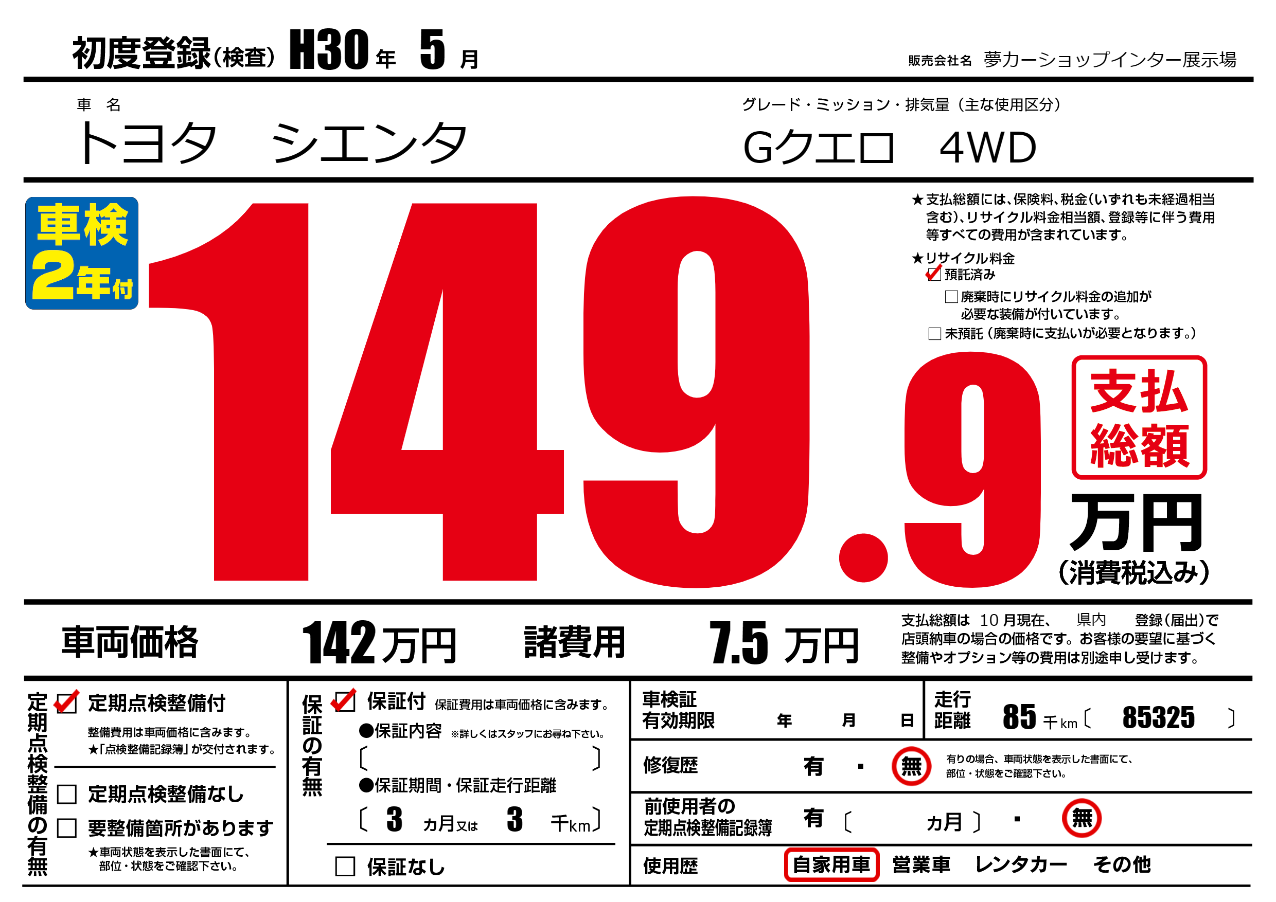 | 車名 | トヨタ シエンタ | グレード ミッション 排気量 |