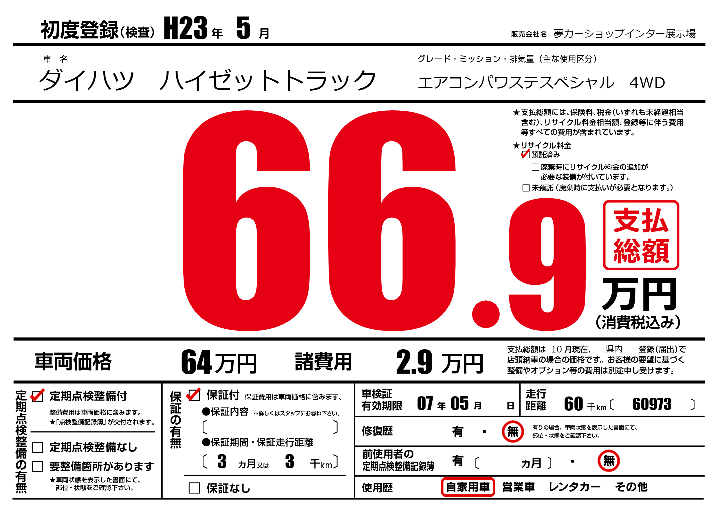 保証付き 保証内容(---) 3ヶ月または(3)千kmまで |