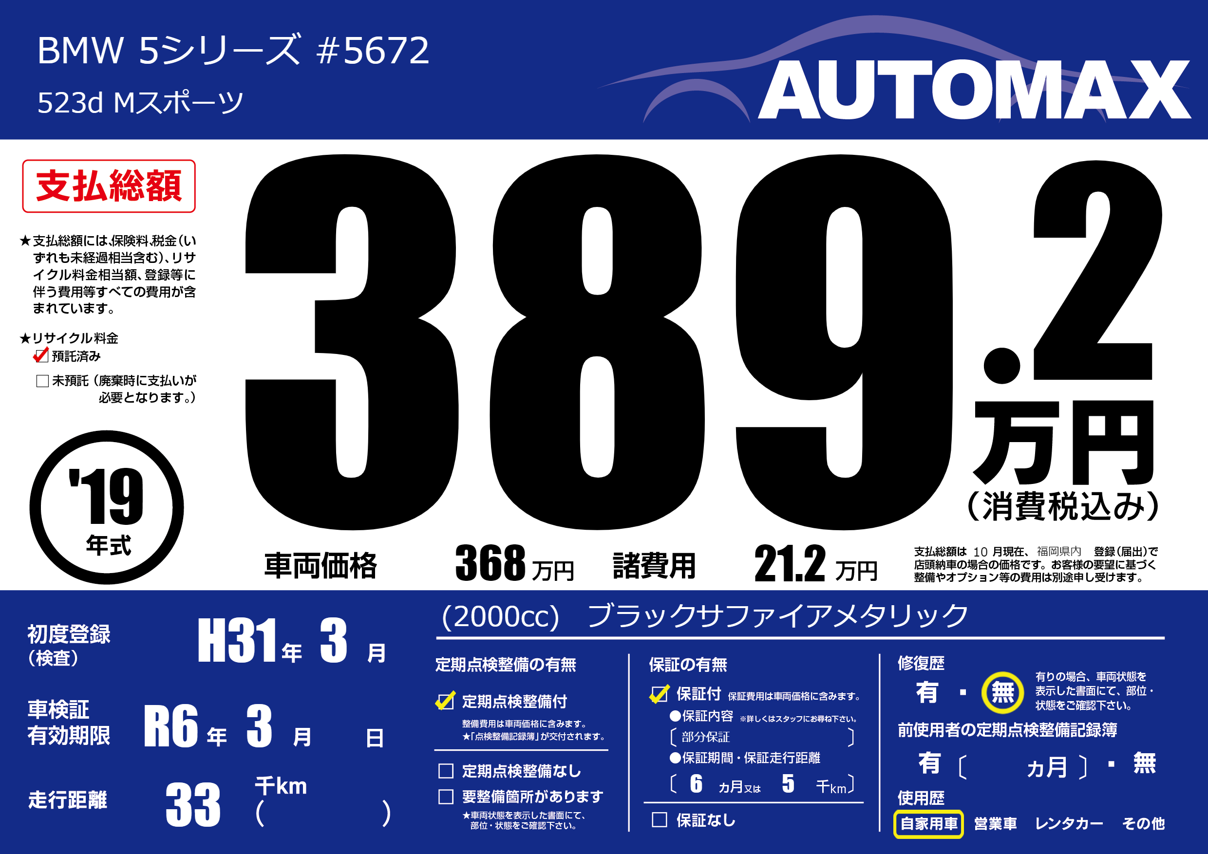 | 車名 | BMW 5シリーズ #5672 | グレード ミッション 排気量 |