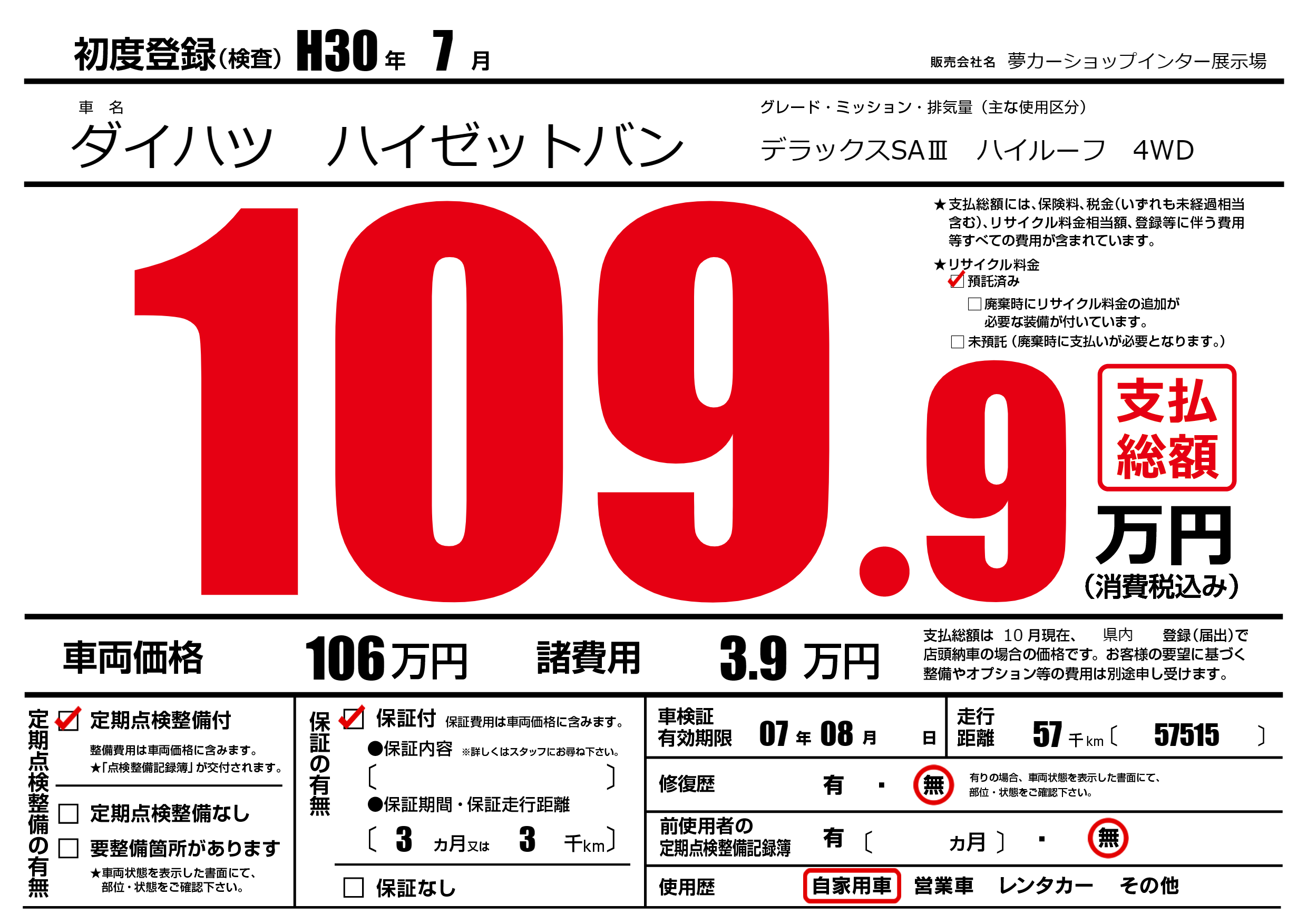保証付き 保証内容(---) 3ヶ月または(3)千kmまで |
