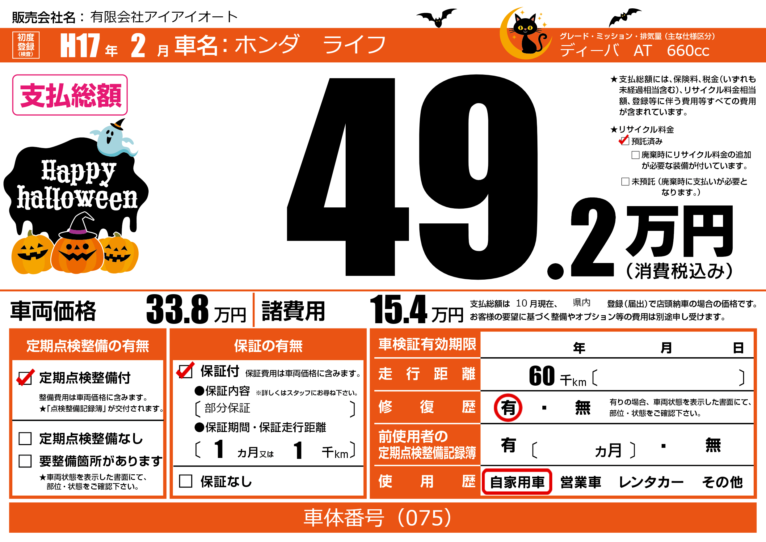 | 車名 | ホンダ ライフ | グレード ミッション 排気量 |