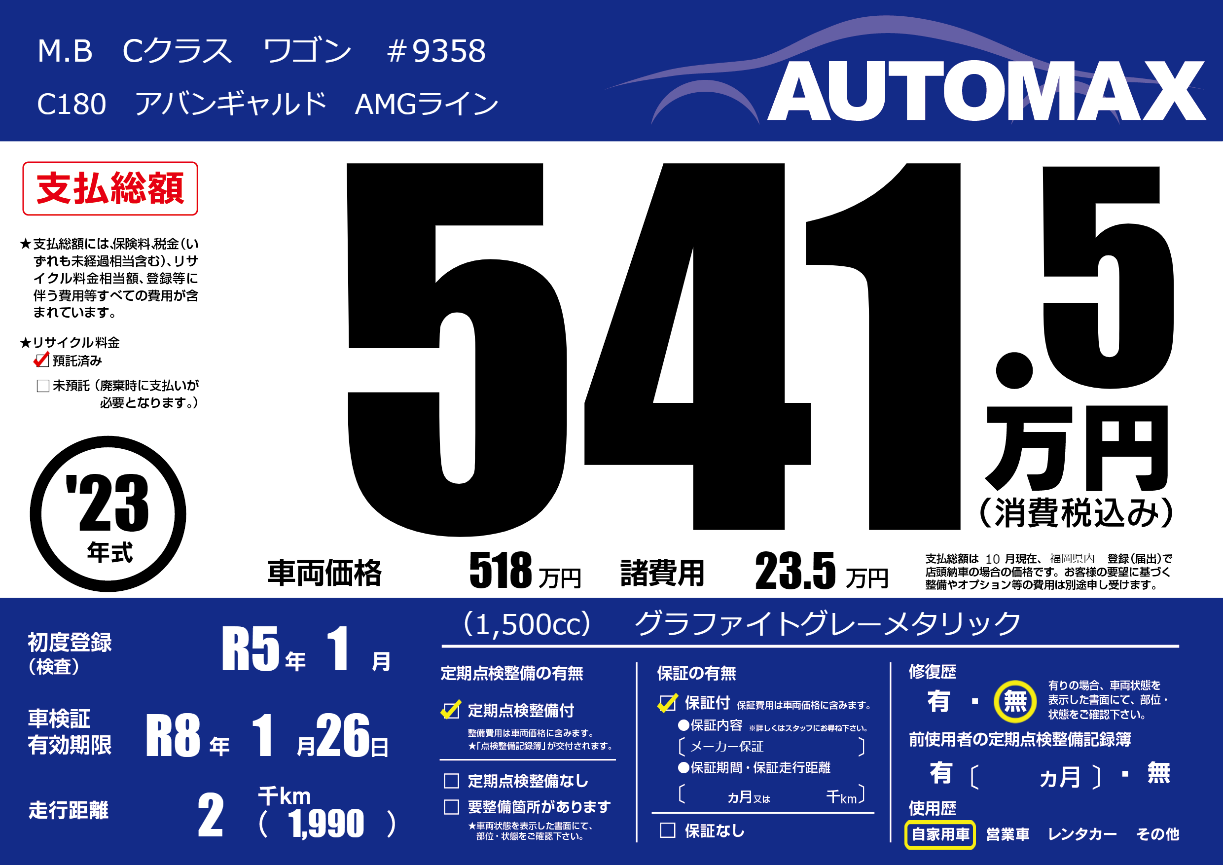 | 車名 | M.B Cクラス ワゴン #9358 | グレード ミッション 排気量 |