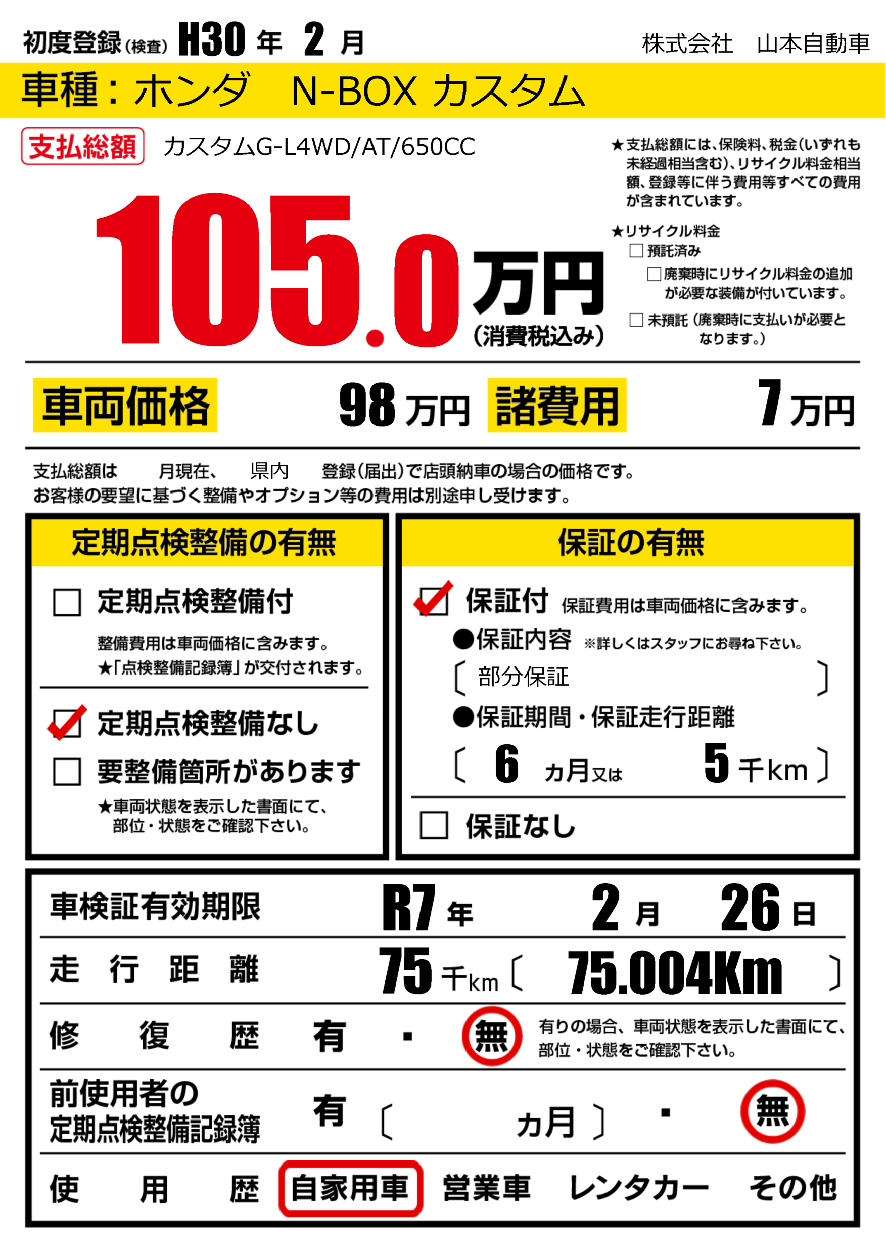 | 走行キロ | 7.5万km | 初年度登録 | H30年2月 |