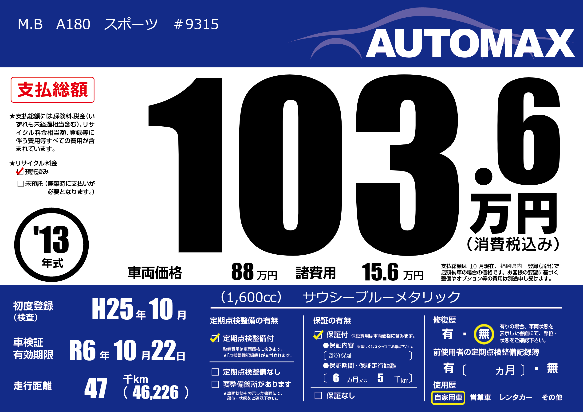 | 車名 | M.B A180 スポーツ #9315 | グレード ミッション 排気量 |