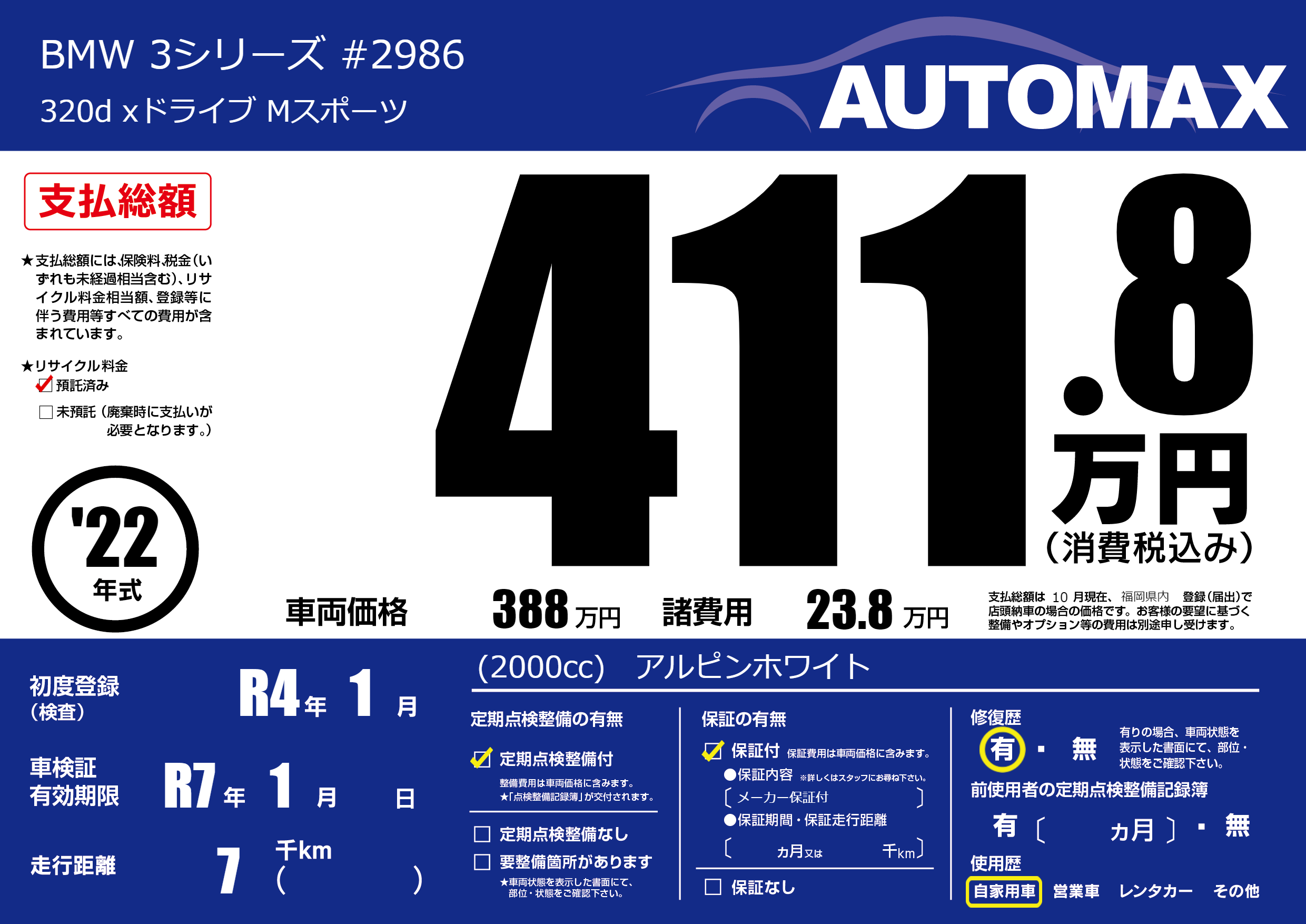 | 車名 | BMW 3シリーズ #2986 | グレード ミッション 排気量 |