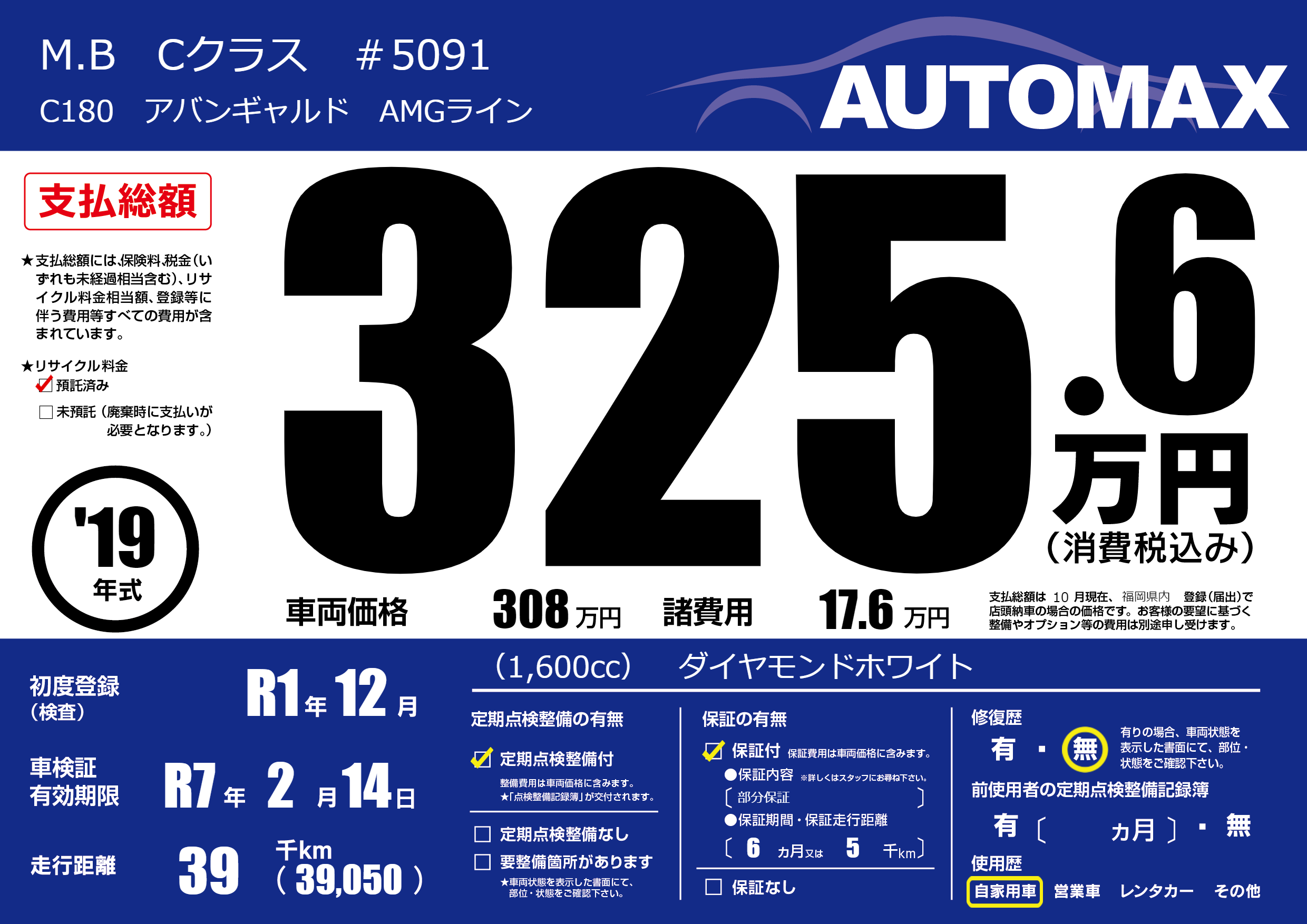 | 車名 | M.B Cクラス #5091 | グレード ミッション 排気量 |