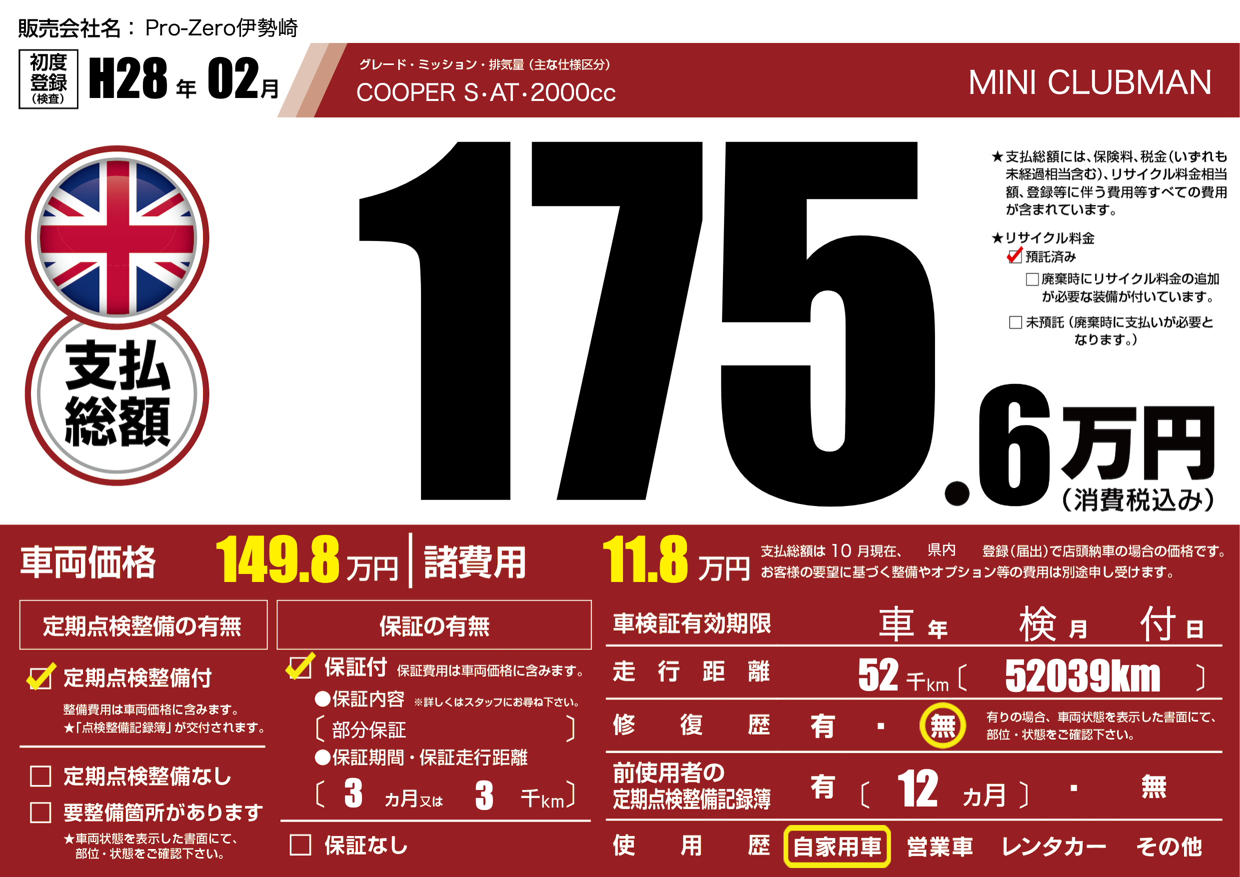 | 車名 | MINI CLUBMAN | グレード ミッション 排気量 |
