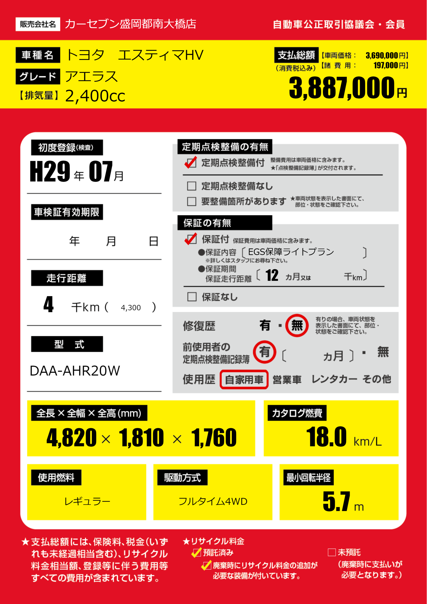 | 車名 | トヨタ エスティマHV | グレード ミッション 排気量 |