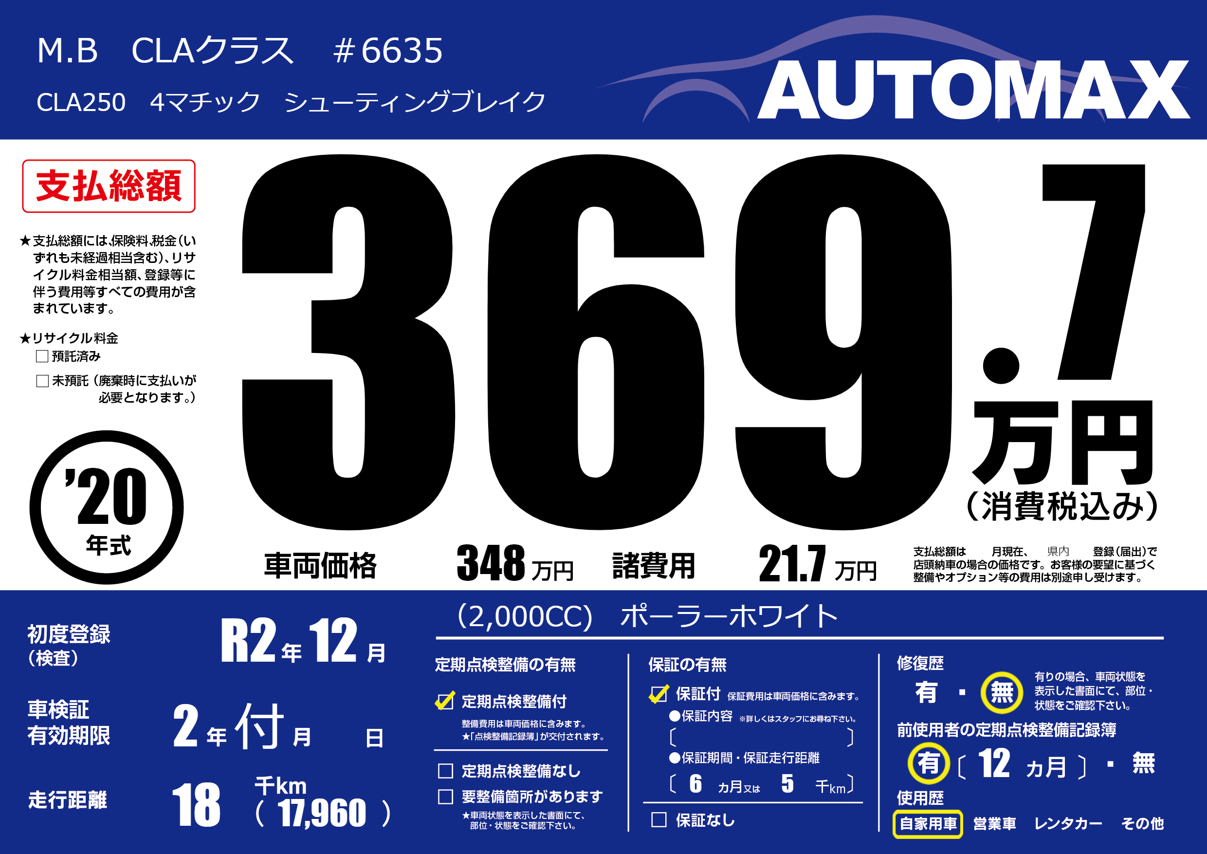 | 車名 | M.B CLAクラス #6635 | グレード ミッション 排気量 |