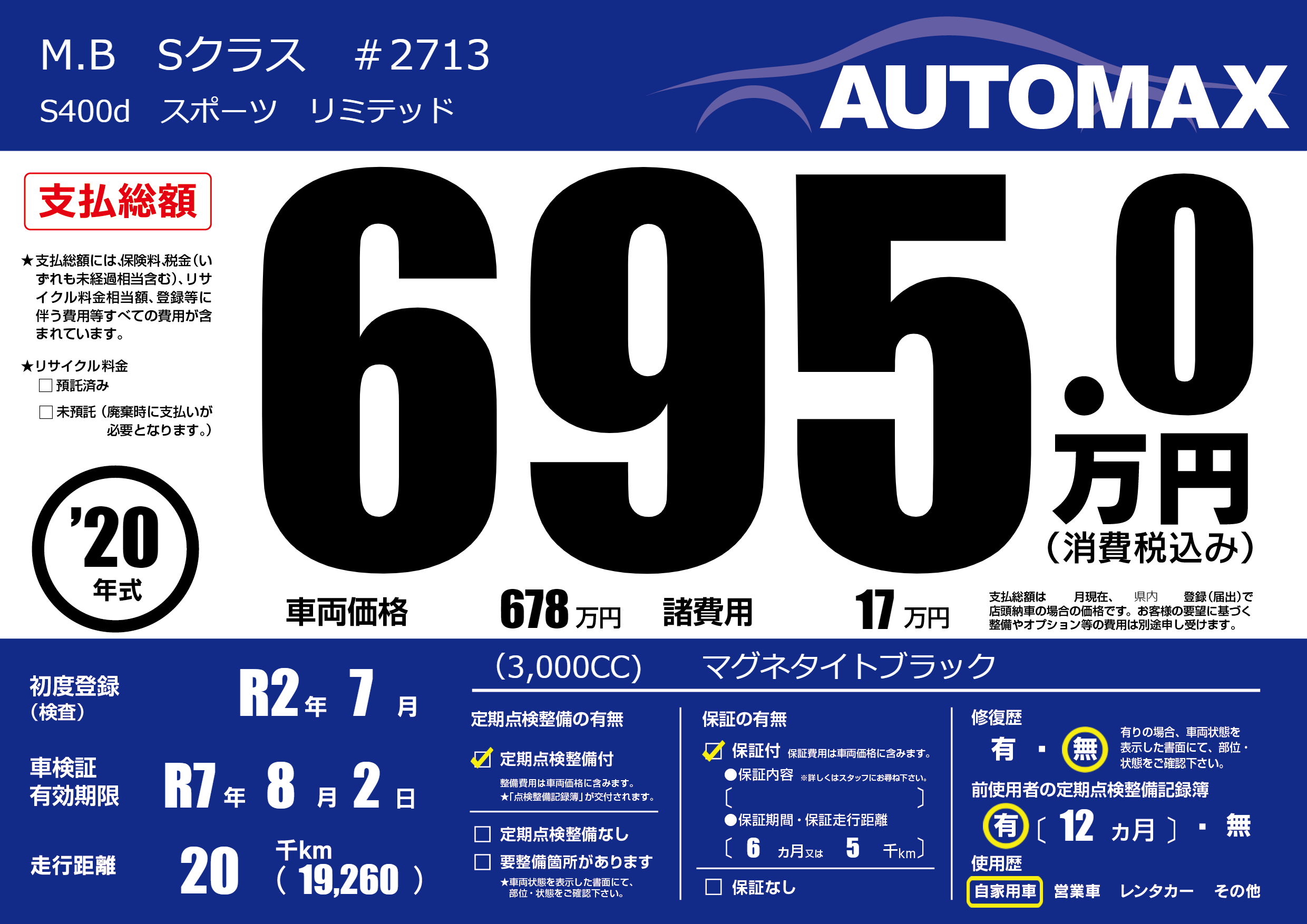 | 車名 | M.B Sクラス #2713 | グレード ミッション 排気量 |