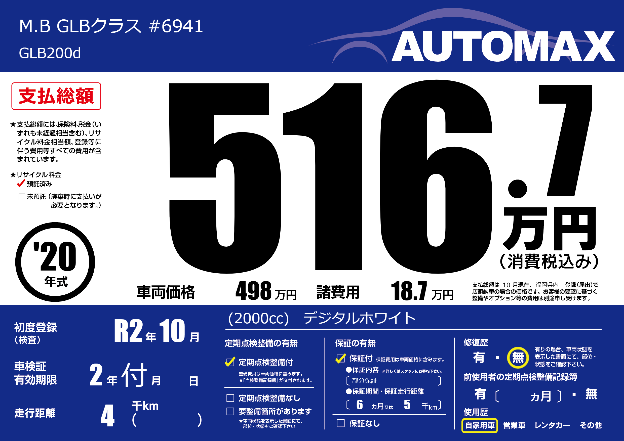 | 車名 | M.B GLBクラス #6941 | グレード ミッション 排気量 |