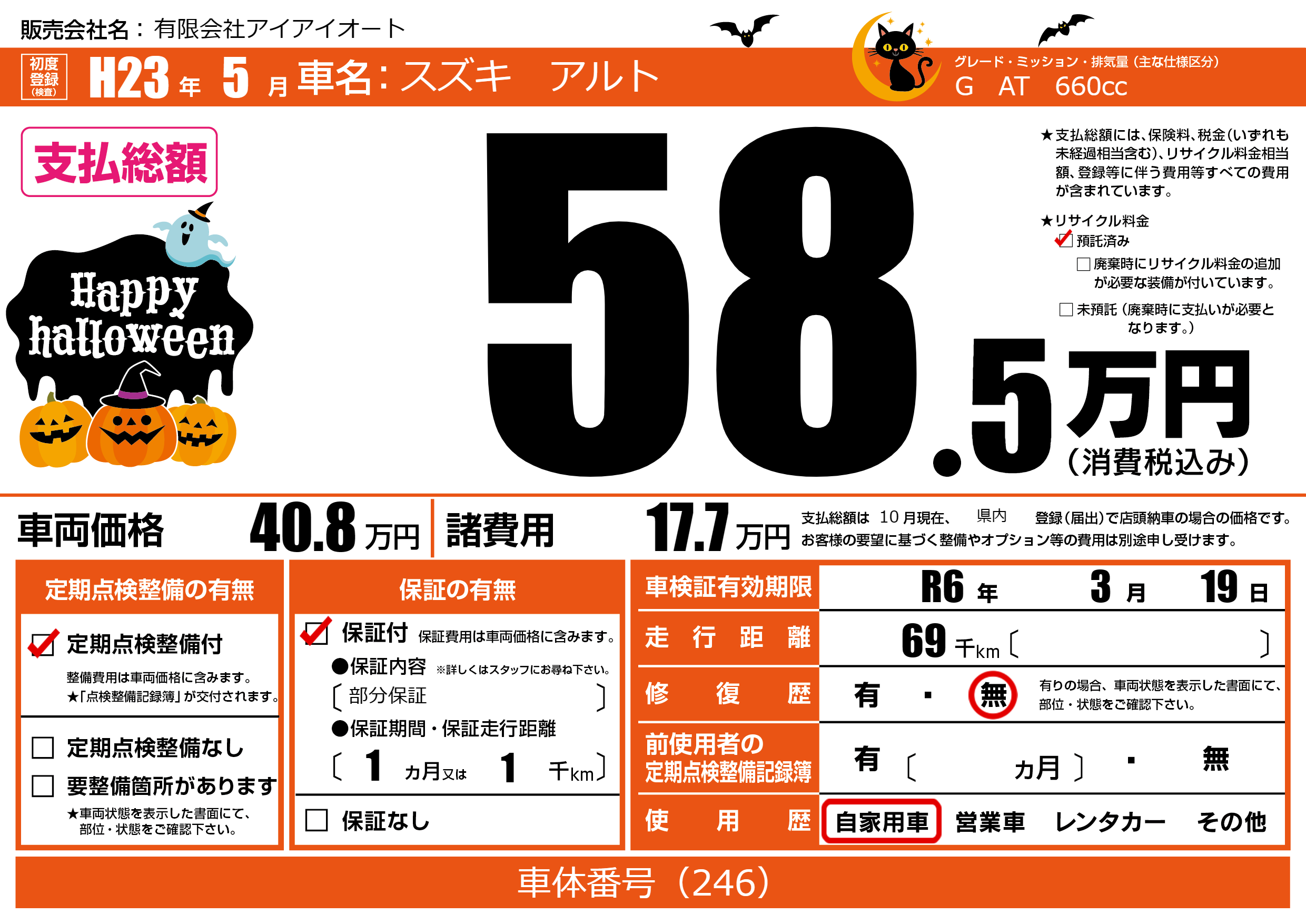 | 車名 | スズキ アルト | グレード ミッション 排気量 |