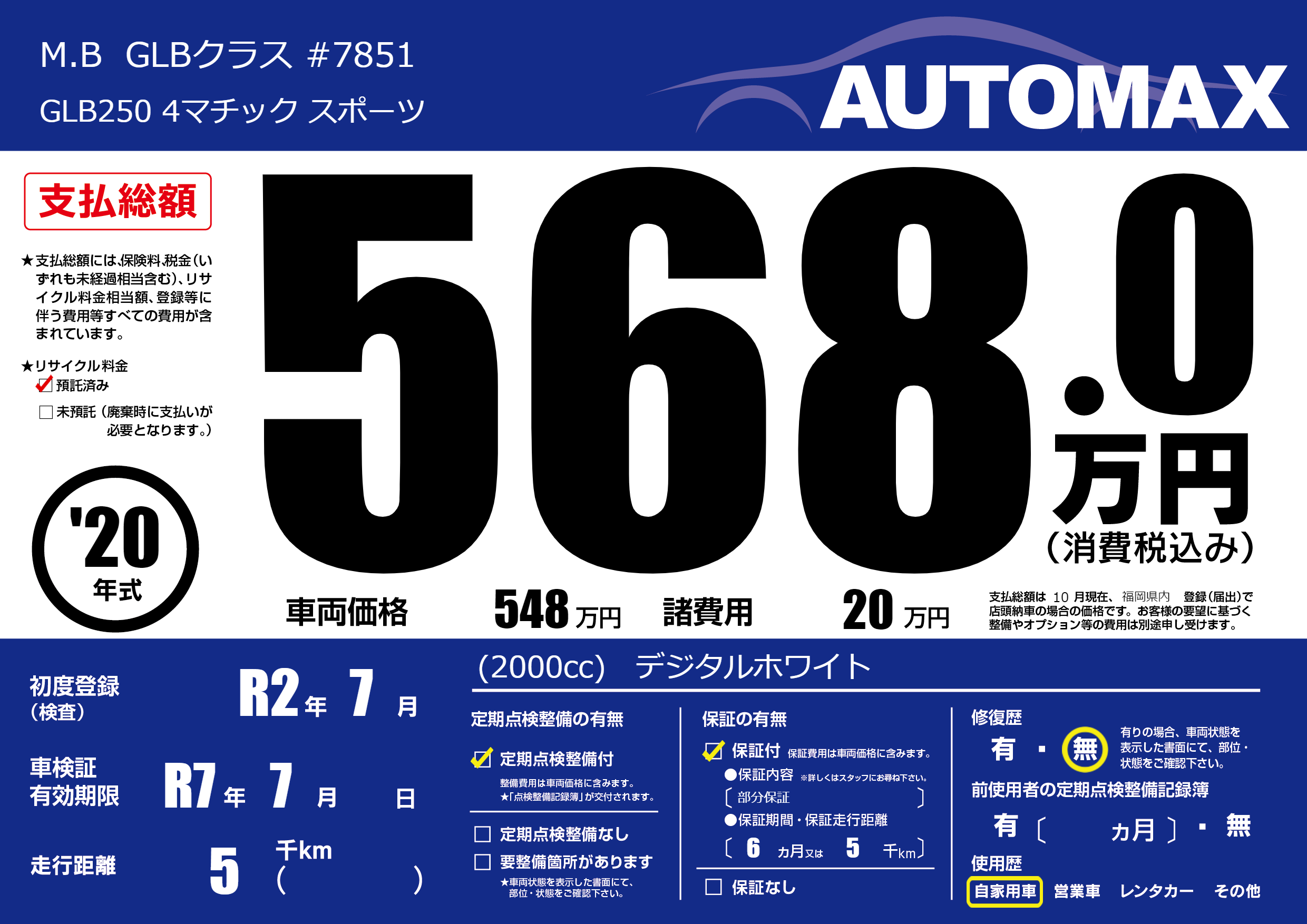 | 車名 | M.B GLBクラス #7851 | グレード ミッション 排気量 |