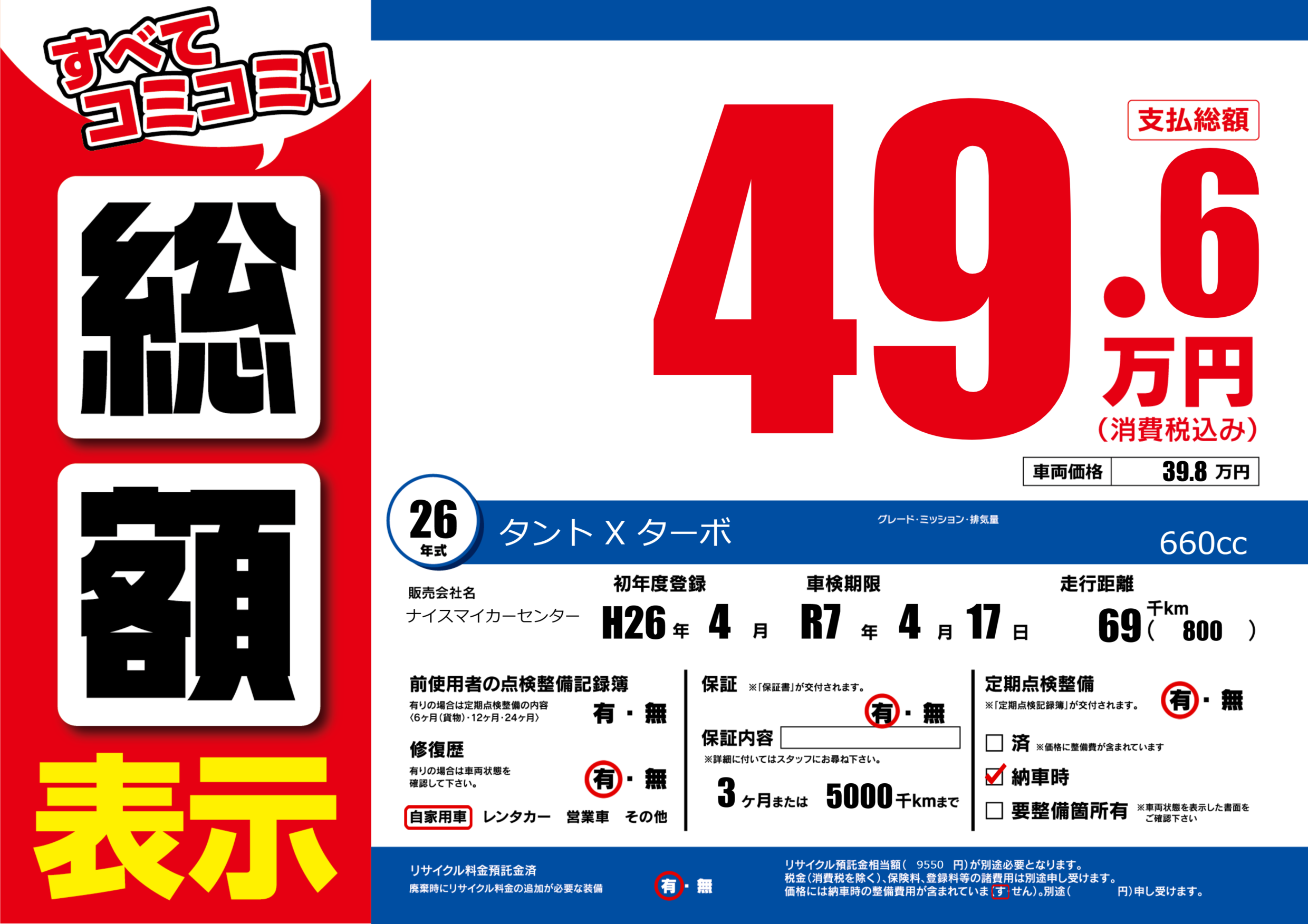 | 定期点検整備 | 定期点検整備あり 納車時あり | ||