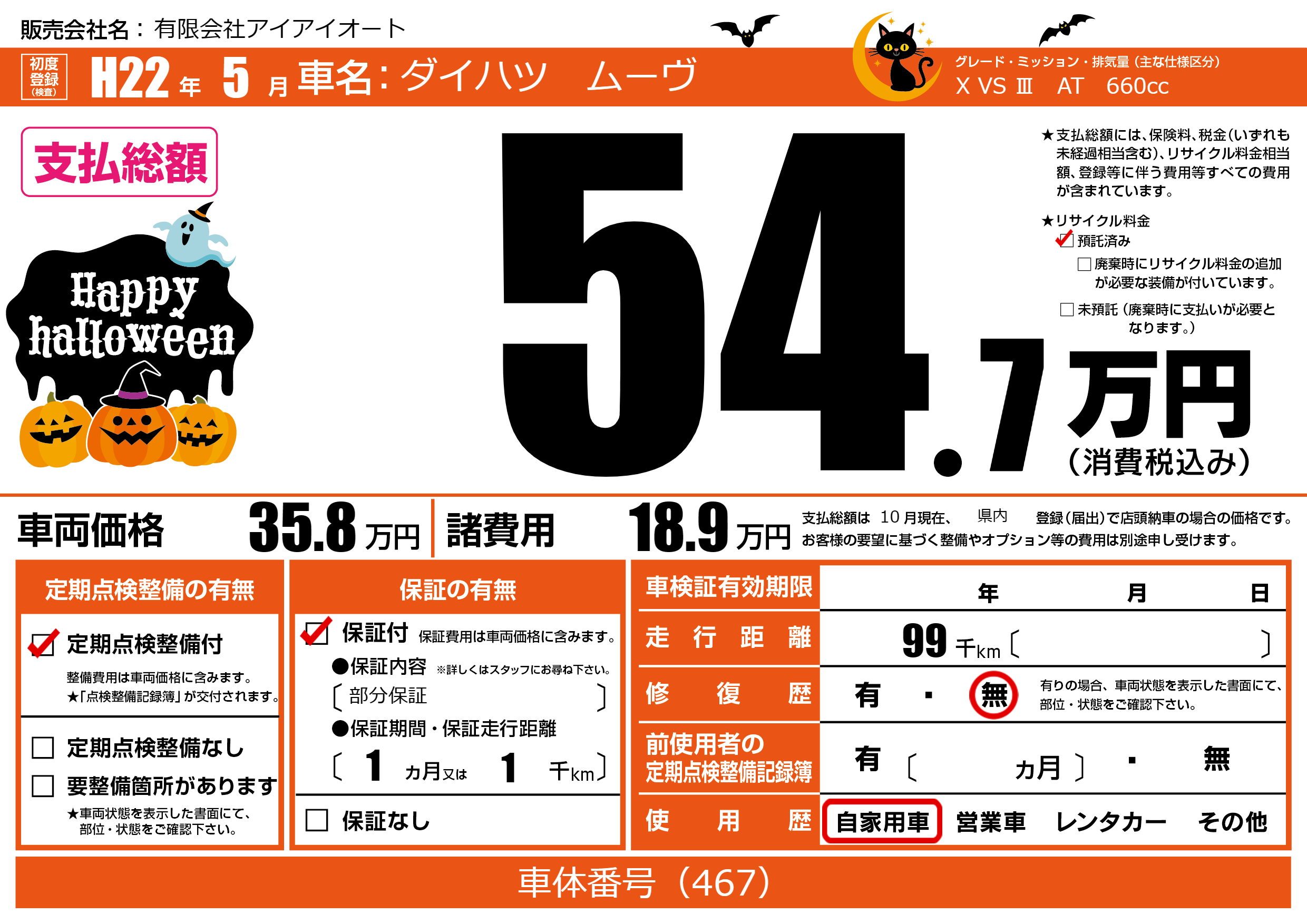 | 走行キロ | 9.9万km | 初年度登録 | H22年5月 |