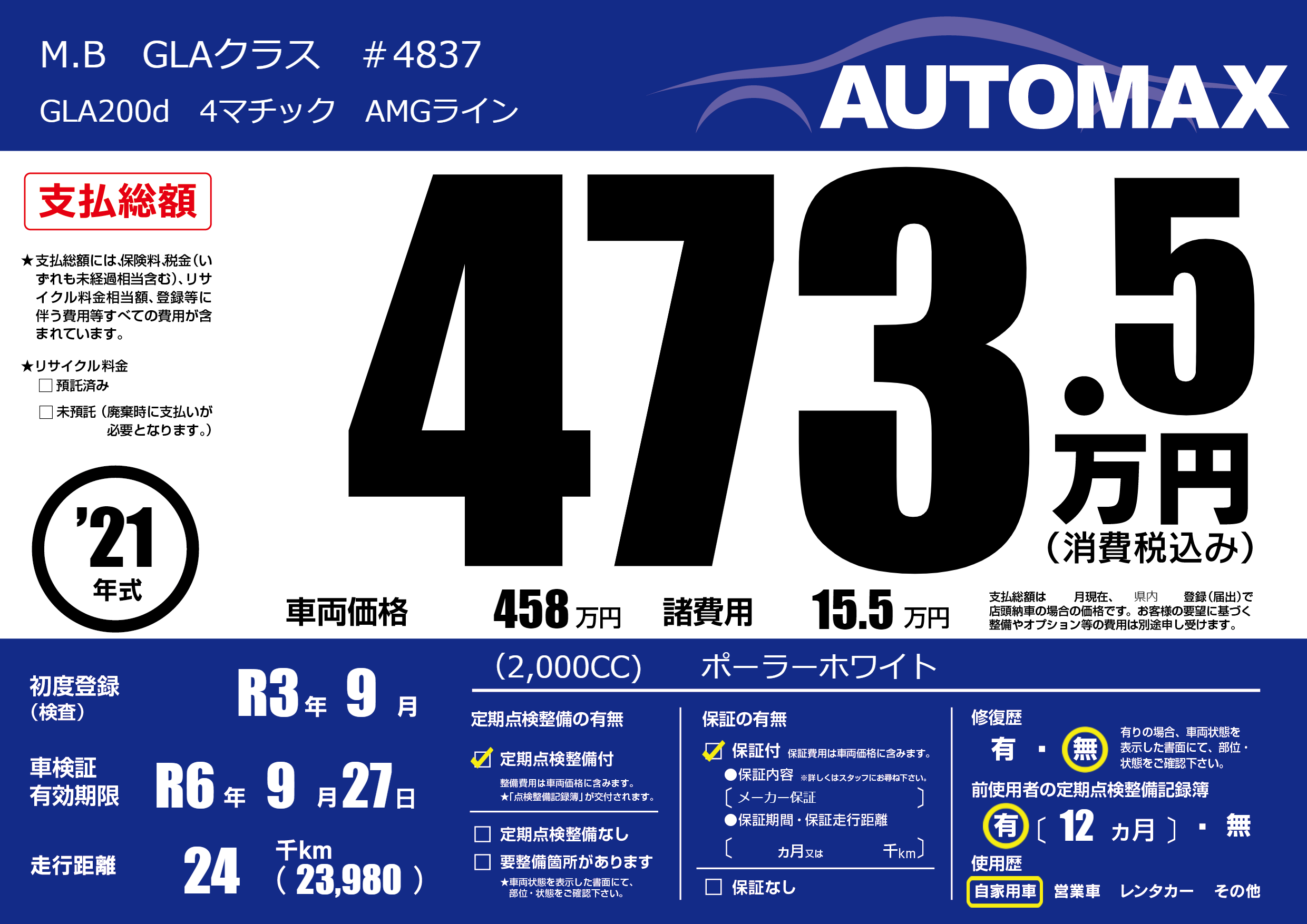 | 車名 | M.B GLAクラス #4837 | グレード ミッション 排気量 |