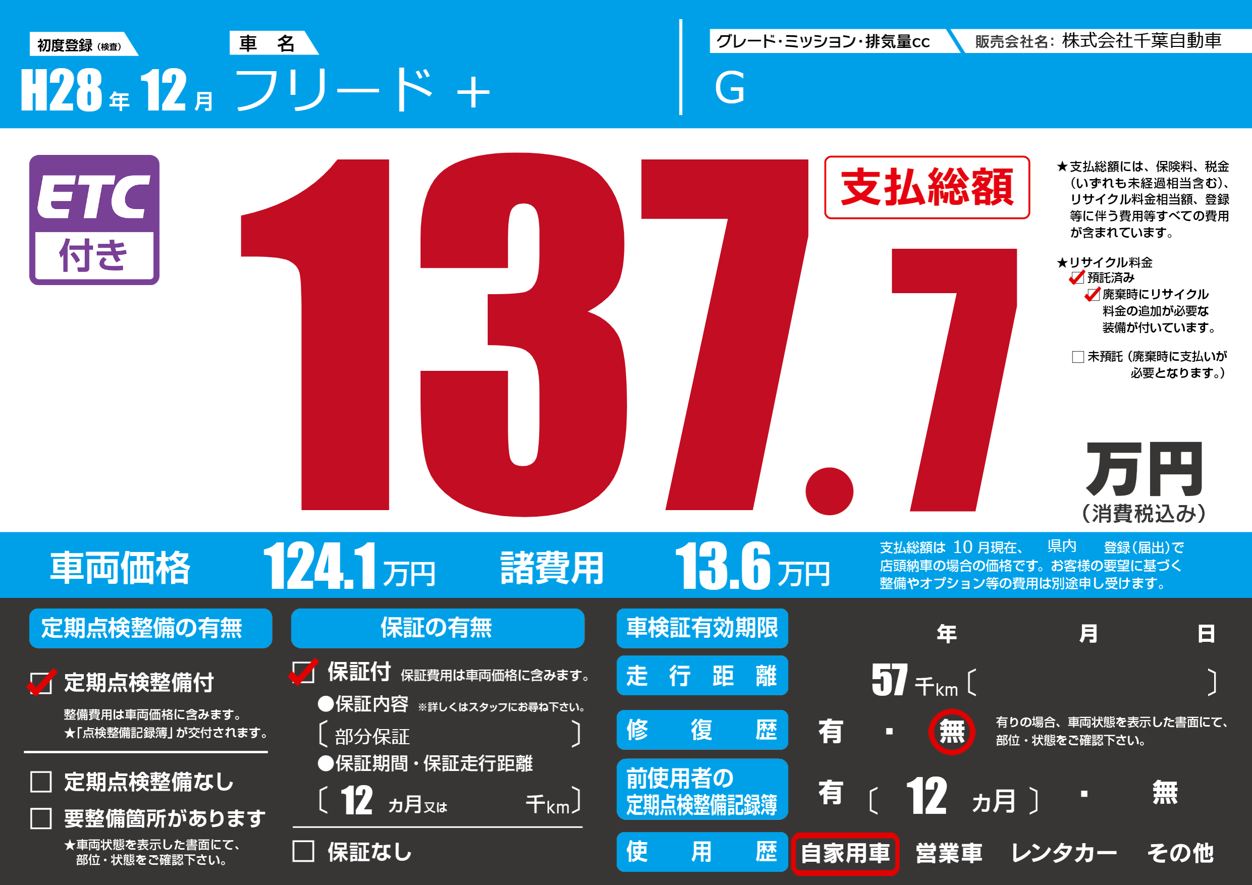 | 走行キロ | 5.7万km | 初年度登録 | H28年12月 |