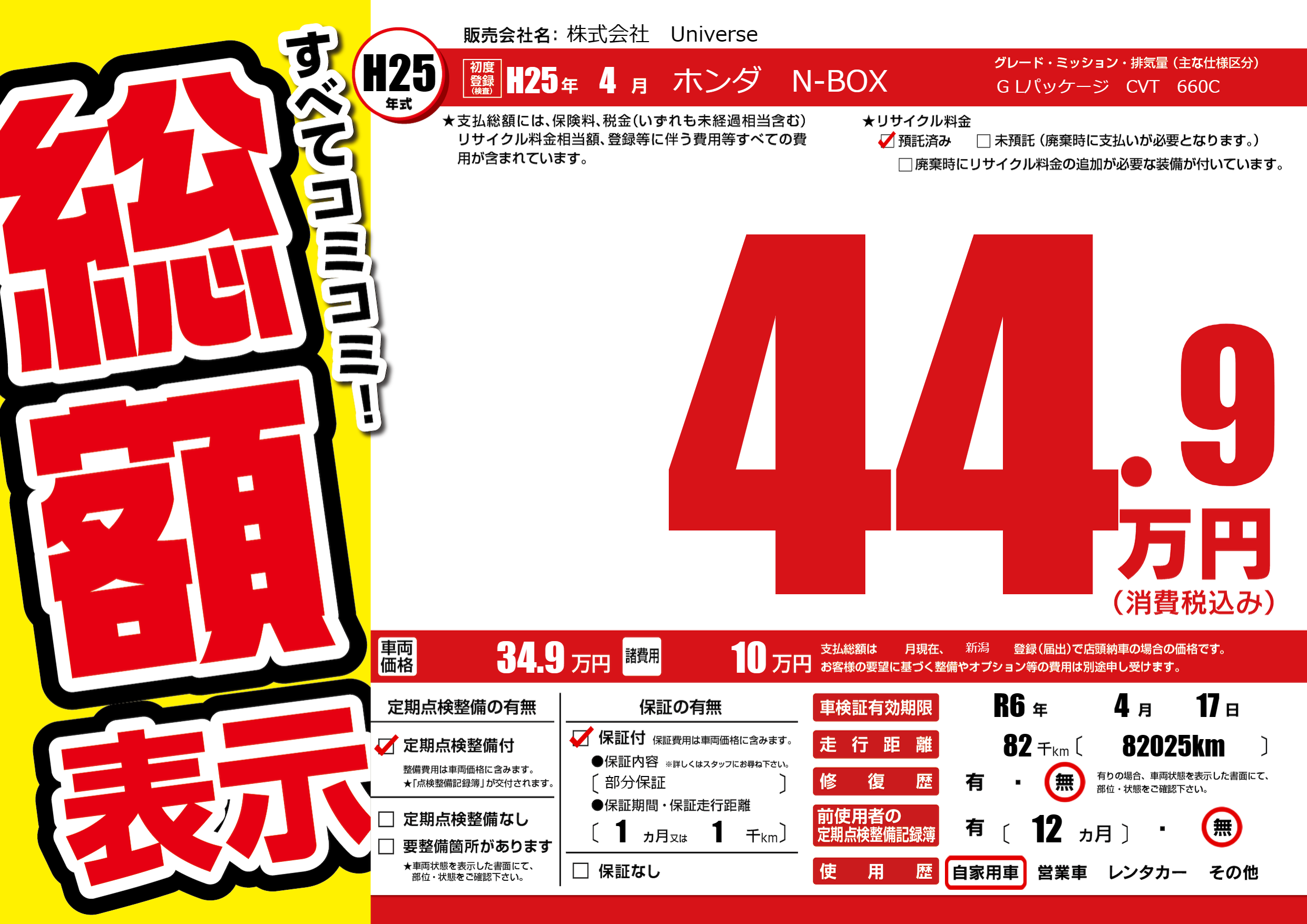 | 車名 | ホンダ N-BOX | グレード ミッション 排気量 |