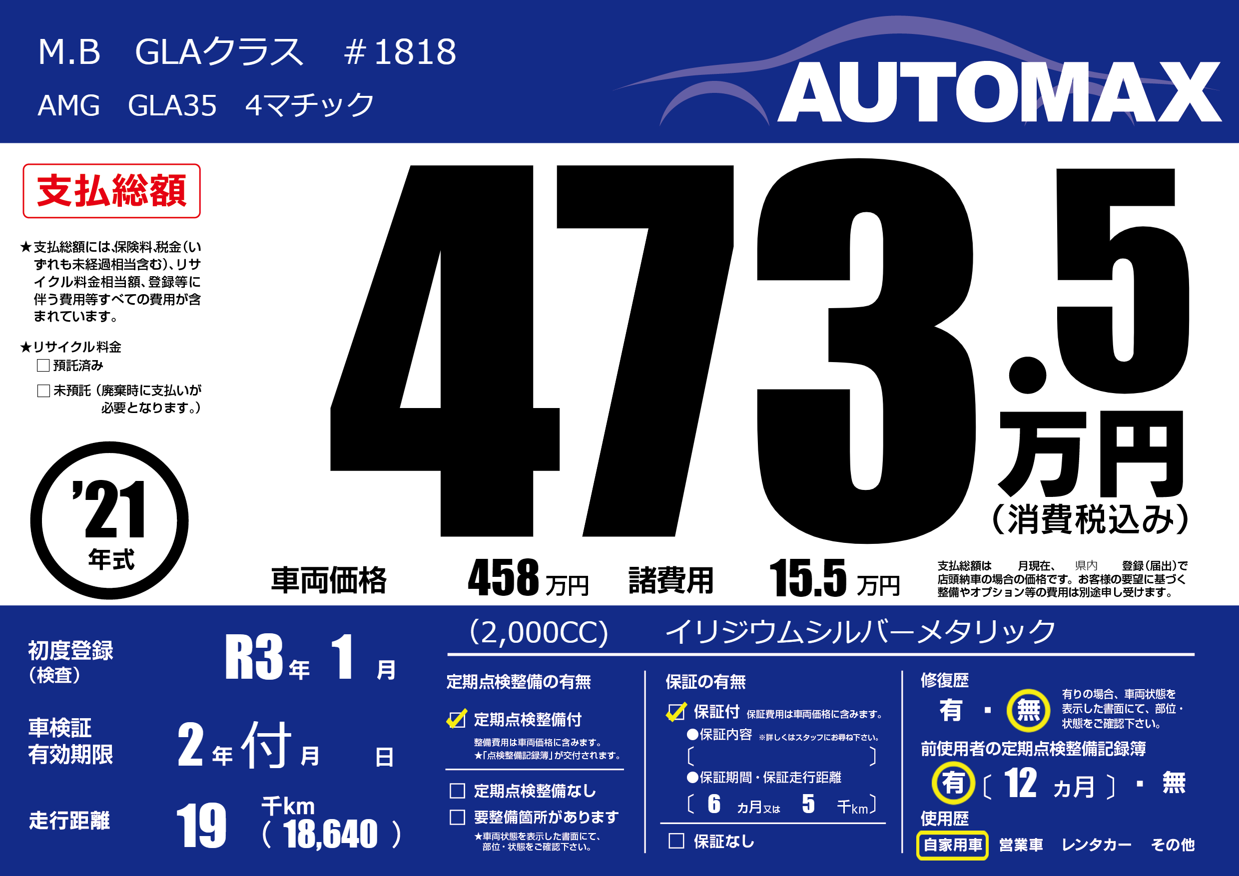 | 車名 | M.B GLAクラス #1818 | グレード ミッション 排気量 |
